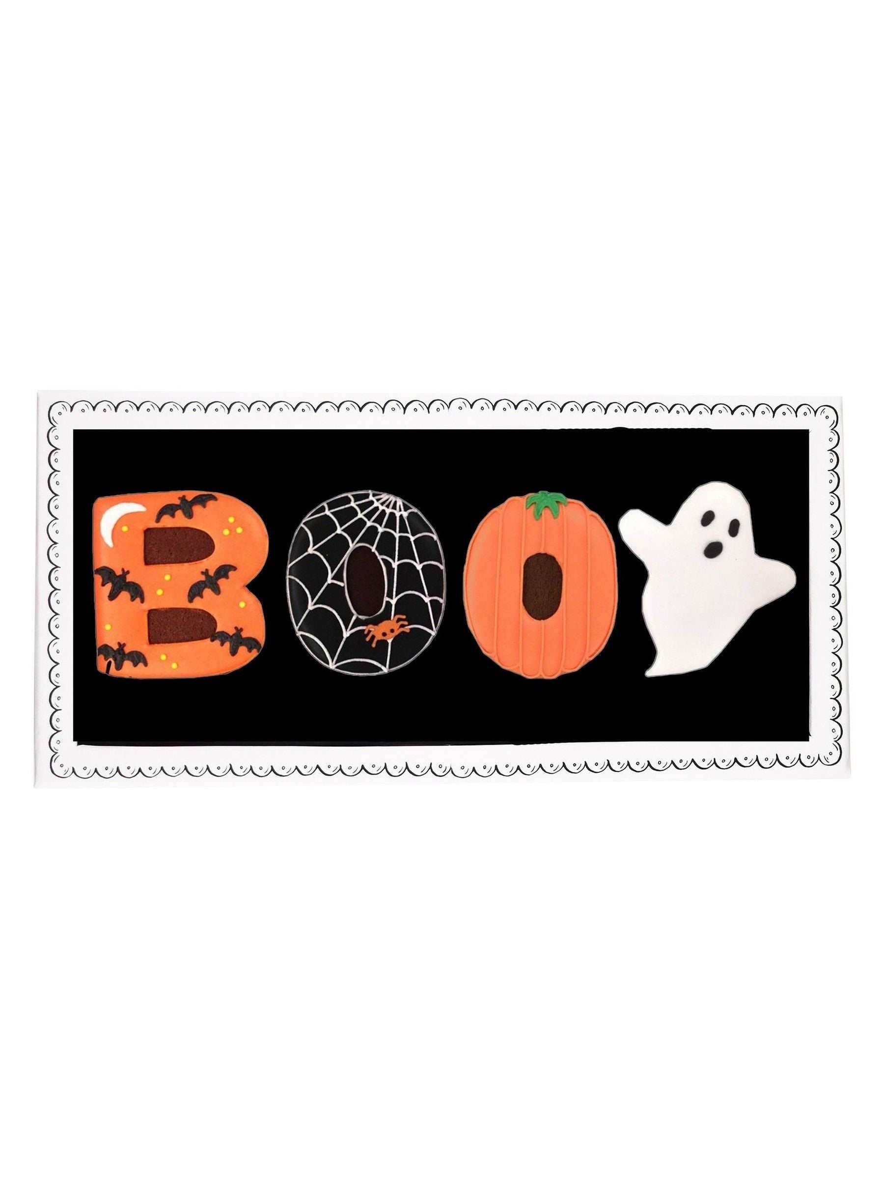 BOO! Give them a fright with our 4 chocolate Boo! letterbox biscuits, hand-iced with a spooky ghost, pumpkin, spider web and bat design. 4 chocolate biscuits presented in our hand illustrated gift box (23cm x 11cm x 2cm, weighs about 60g). Everything we make is hand-crafted in our London bakery using traditional baking techniques and only the finest local sourced ingredients to give that perfect home-baked taste.