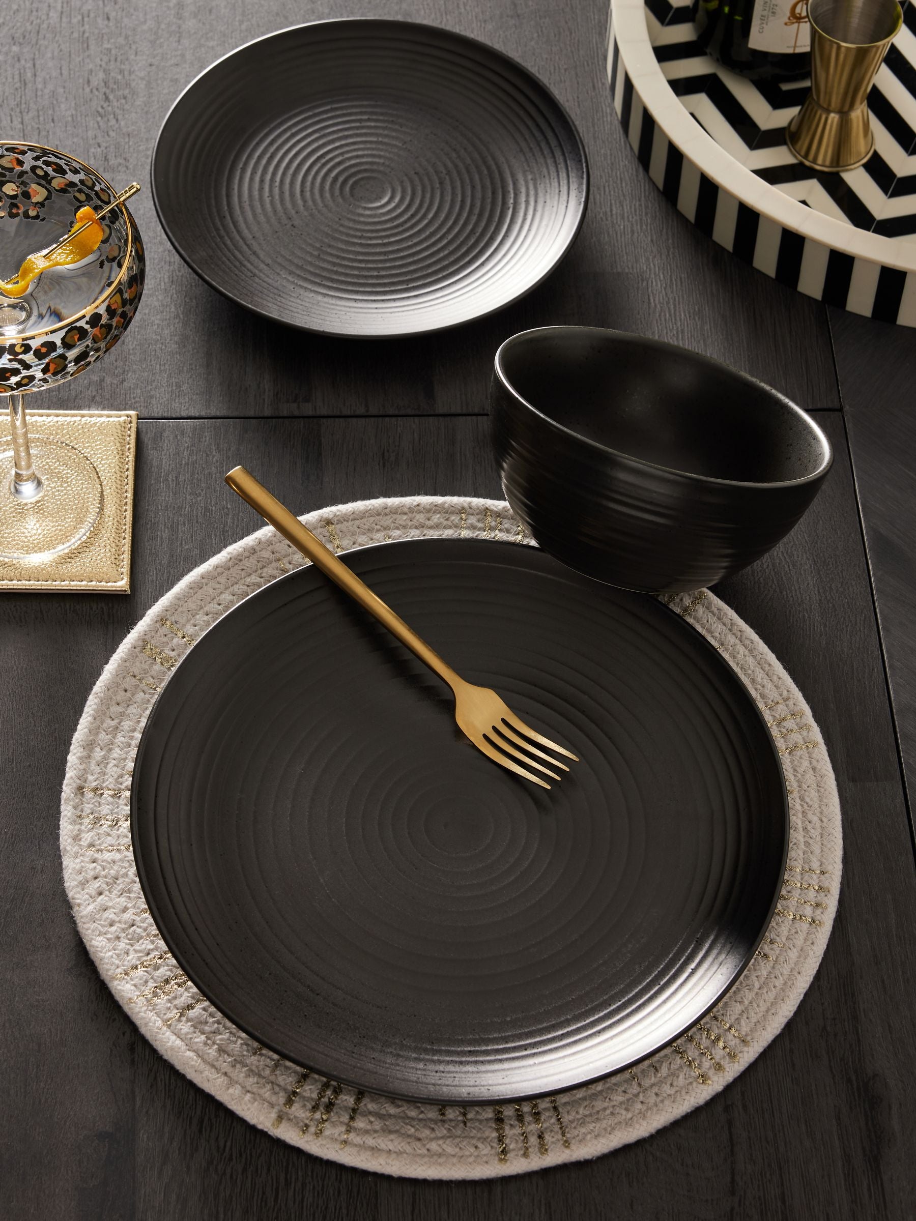 In a contemporary, semi-matte finish with a soft ripple design and subtle speckle, our black Bronx dinner set includes 4 dinner plates, 4 side plates and 4 bowls. The perfect dining solution, this dinner set is made from stoneware, which is both durable and practical, plus, it's dishwasher safe.