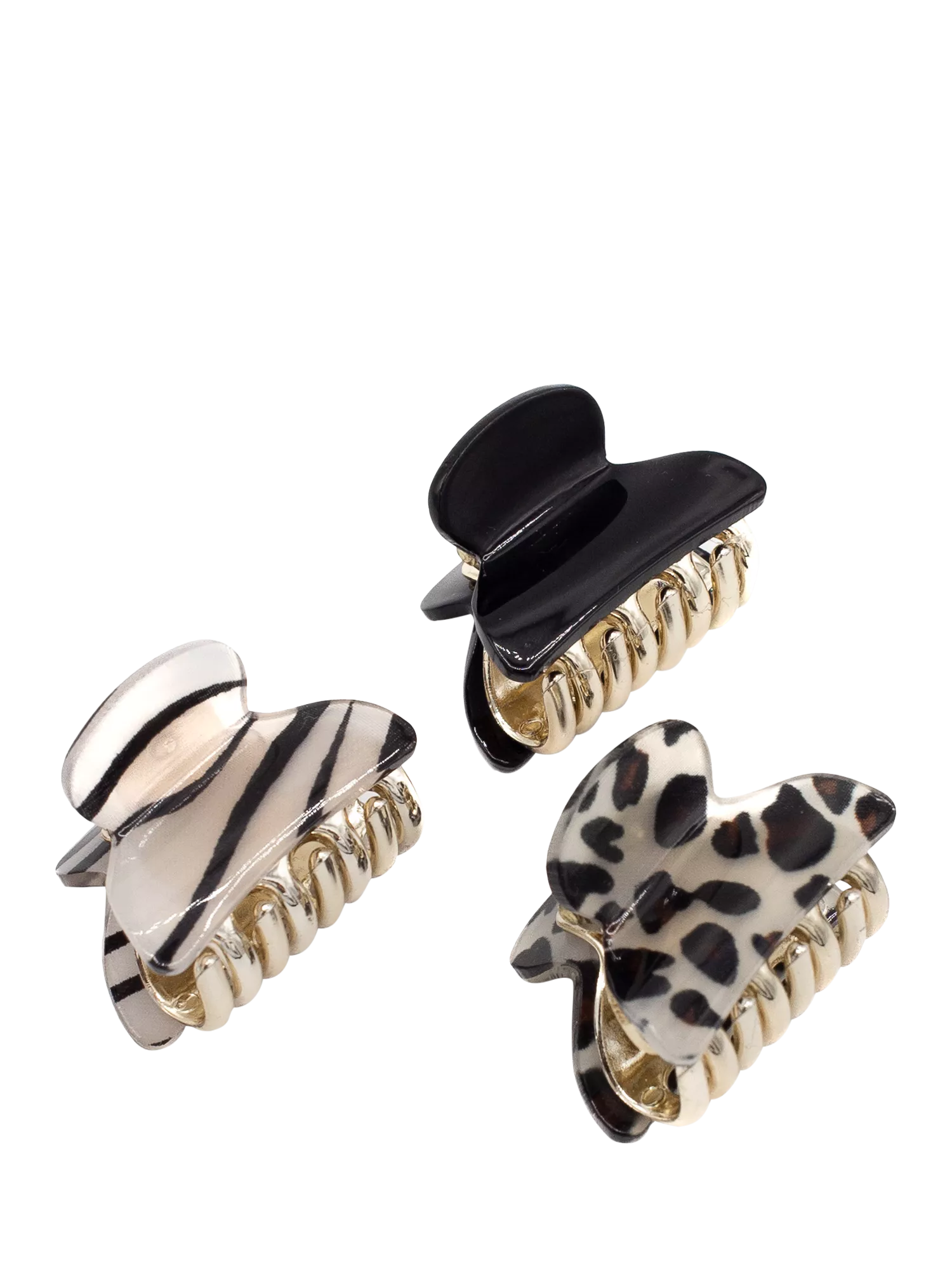 A trio of mini hair claws in black, leopard print and zebra print, all with gold-tone hardware. Wear them together or mix and match to suit your outfit and your mood. A perfect set for keeping in your bag for those moments when a speedy updo is needed! Supplied with a Bloom & Bay dust bag for storage and protection.