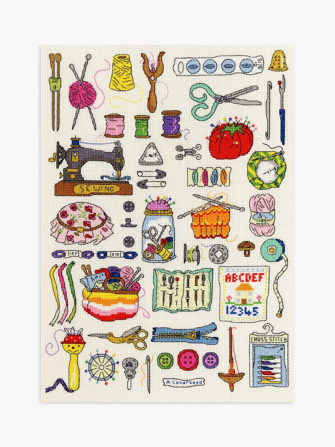 Suitable for those with intermediate skills, this kit contains everything you'll need to create the sewing hobbies design including 16 count Zweigart Aida, pre-sorted stranded cottons, needle, stitch diagram (including alphabet for personalisation) and instructions.