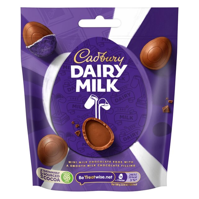 Classic, creamy Cadbury Dairy Milk is ready for Easter. Why not show you care and hide these delicious, chocolate-filled eggs around the garden, ready for a family fun egg hunt? Cadbury Easter, hide an egg for someone you love. Made with sustainably sourced cocoa. Vegetarian friendly. Mini Milk Chocolate Eggs with a Smooth Milk Chocolate Filling 100% Sustainably Sourced Cocoa Suitable for vegetarians