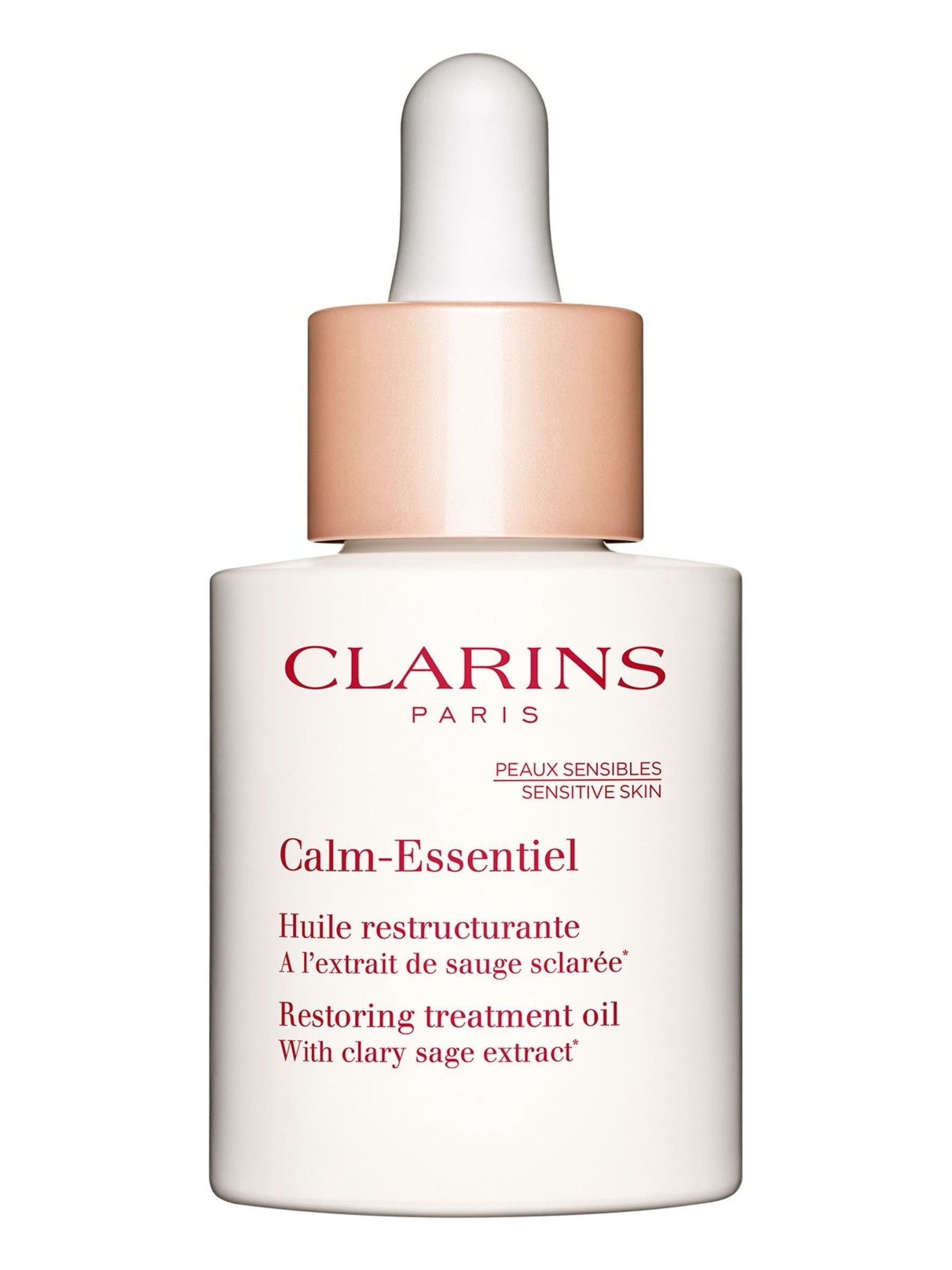 Calm-Essentiel Restoring Treatment Oil is an SOS treatment that instantly calms, soothes discomfort, and nourishes the skin. The texture is delicate and enriched with camellia oil, apricot kernel oil, and scareolide to soothe and protect the sensorial receptors to reduce sensitivity.