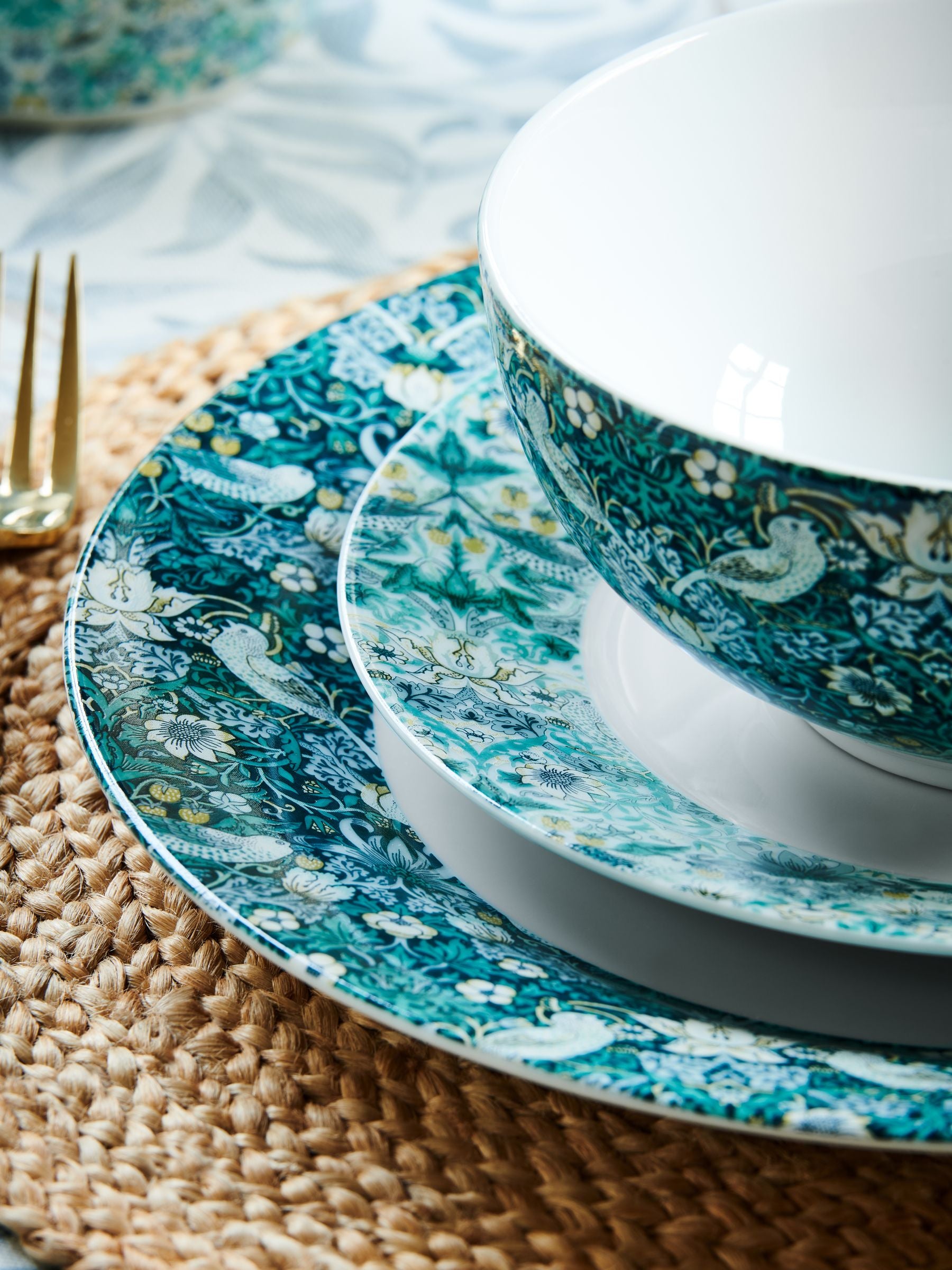 Treat your tablescape to the teal blue Strawberry Thief Dinner Set from Clarke & Clarke. Coated in William Morris' iconic Strawberry Thief print, this pure porcelain set contains: 4 dinner plates, 4 side plates and 4 cereal bowls all in mixed tones of teal blue.