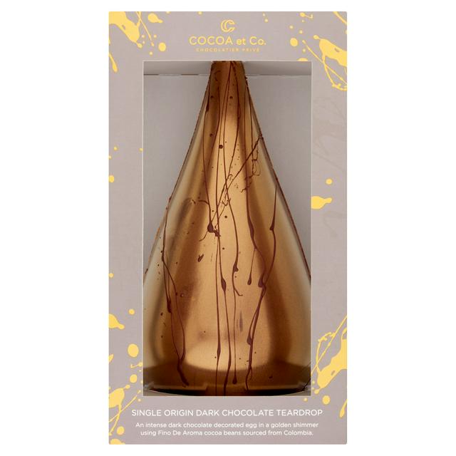 Product details Description Single origin Colombian dark chocolate hollow egg with an edible gold and dark chocolate decoration. An intense dark chocolate decorated egg in a golden shimmer using Fino De Aroma cocoa beans sourced from Colombia. Quick nutrition guide Per 25g Typical Values ENERGY 598kJ 144kcal 7% FAT 10.0g...