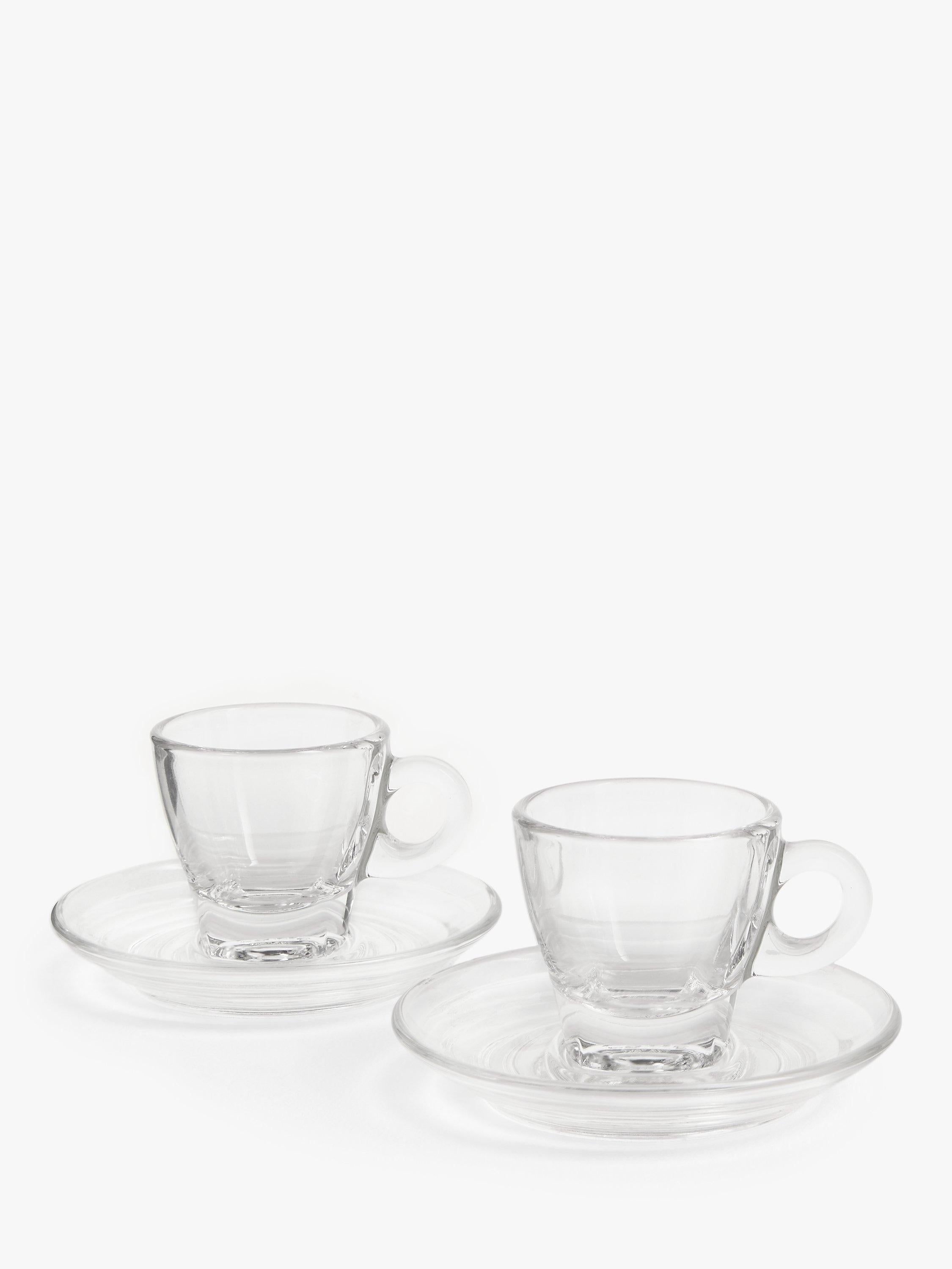 Designed for visually enjoying a well-made espresso or macchiato as well as the taste, this pair of coffee cups and saucers are made of glass. The thick, durable glass retains heat to keep your coffee hot for longer. The glassware is dishwasher safe for fuss-free cleaning.