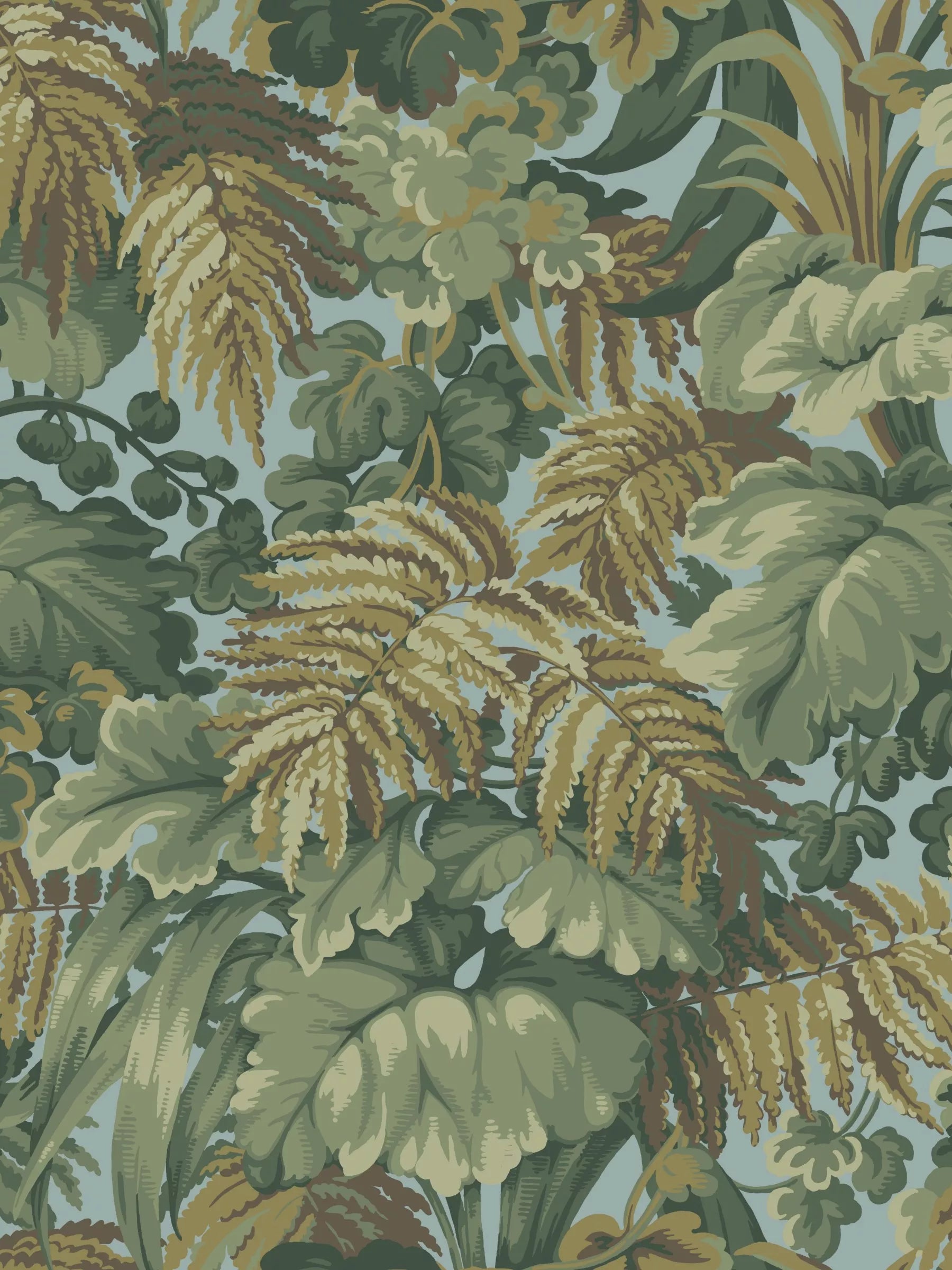 Inspired by the Majorelle Gardens in Marrakesh, Royal Fernery is a lush motif of abundant leaves printed in chalky, all matte palettes of khaki and print room blue, forest green, warm grey, and the soft yet arresting slate blue and blush pink. The design's tapestry-like feel originates from an old French archive piece making the paper an opulent feature in any interior.