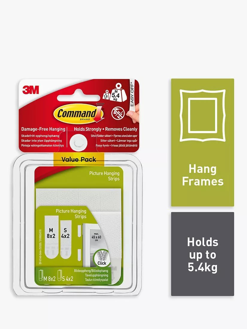 Simply apply four hanger strips to each side of your picture frame. The strips provide grip and security, without being visible. If you need to move, take down your pictures or when you're decorating, the strips remove cleanly, leaving no nail holes or sticky residue on your wall. The strips lock and relock so your frame can be removed and repositioned until it's just right.