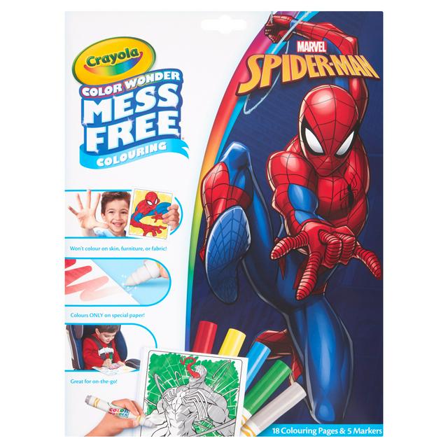 Product details Description Spiderman has come to Color Wonder with 18 colouring pages and 5 Color Wonder markers for mess-free fun! Great for colouring on the road or at home, the Crayola Color Wonder Mess-Free Markers allow kids to fully express themselves without making a mess. These markers are filled...
