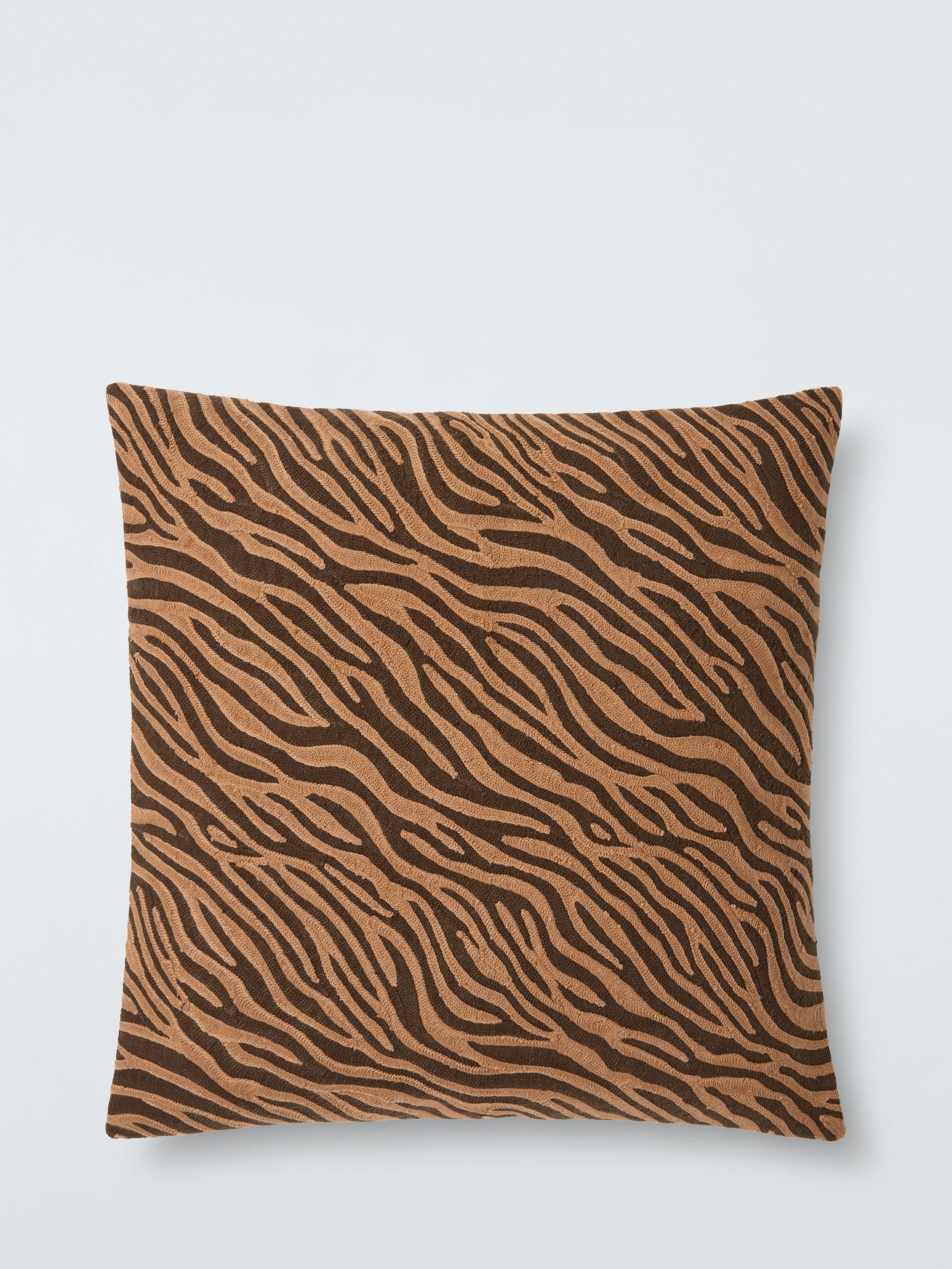 The John Lewis Crewel Tiger Cushion presents an Auburn hue and striking pattern. Intricate machine embroidery showcases detailed crewel work, creating a highly textured focal point. Filled with resilient feathers, this durable home accessory offers both luxurious comfort and bold visual appeal for your sofa. It is a fine piece.