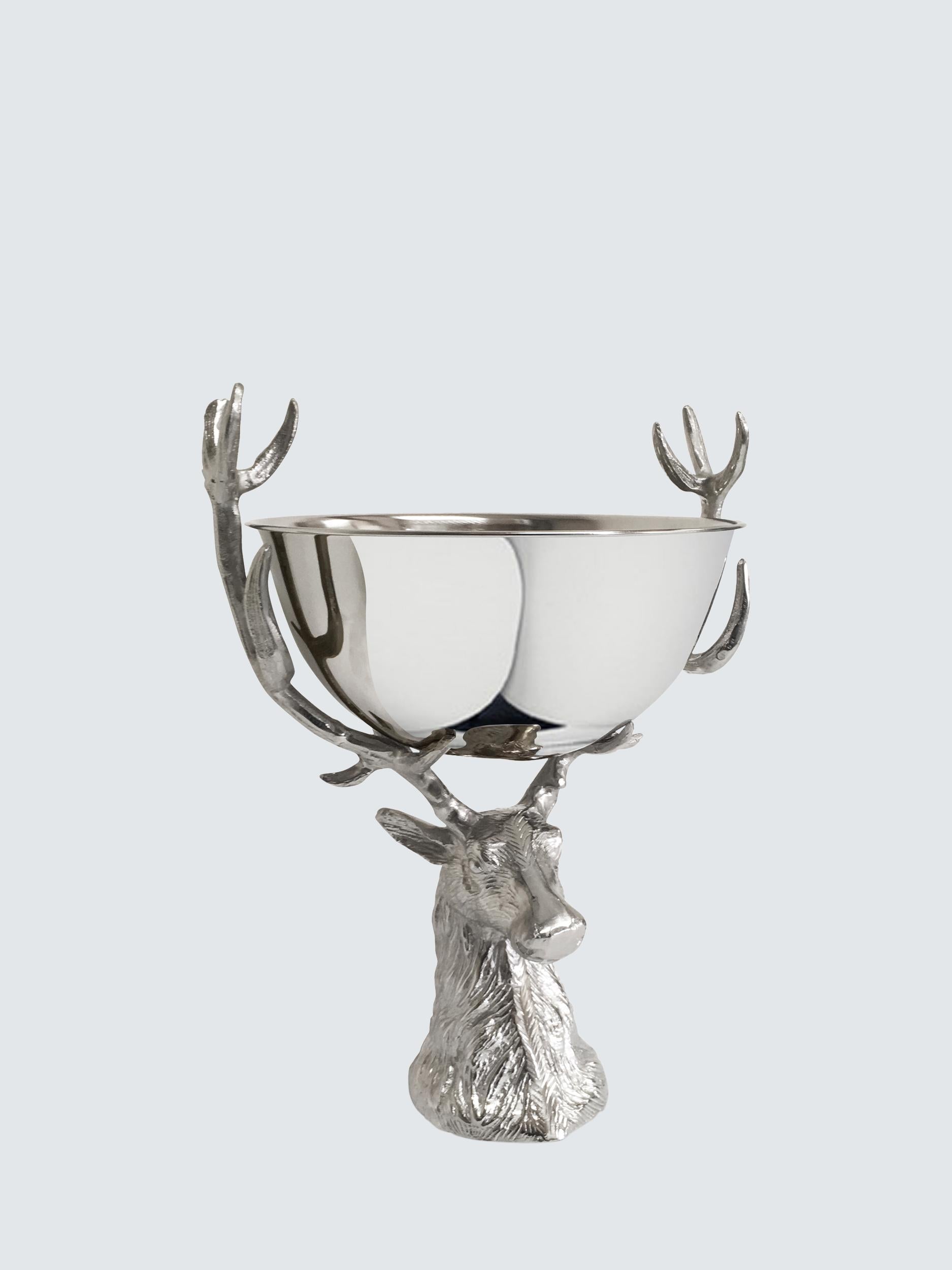 The magnificent stag head, made from Nickel Plated Aluminium, holds aloft the Stainless Steel bowl with his sturdy antlers Featuring intricate detailing, beautifully illustrating Culinary Concepts' trademark craftsman quality, this piece is bound to impress. The removable bowl will comfortably hold up to three standard-size wine bottles, or as it is food safe you can use it as an elaborate fruit or punch bowl - whatever culinary delight you dare to declare worthy of such display.
