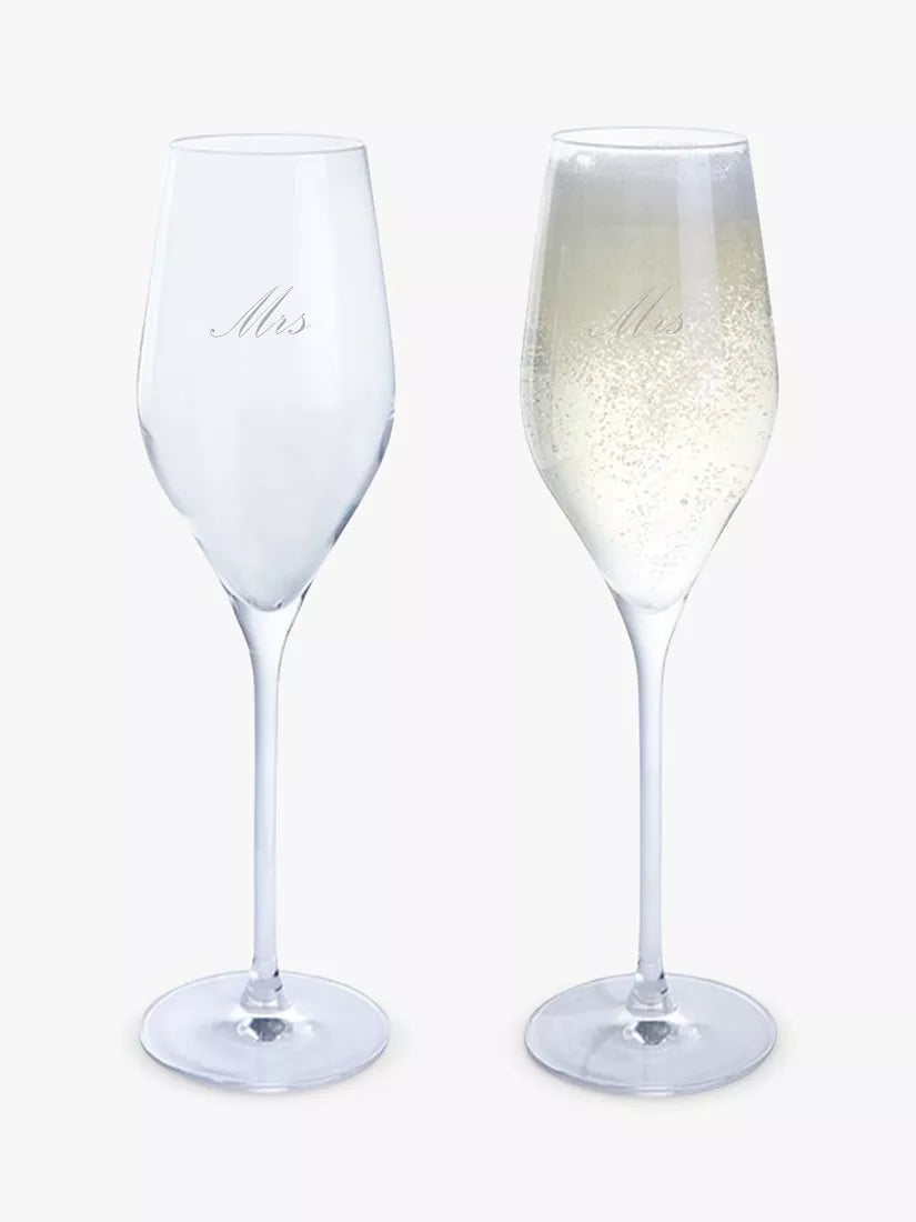 Toast to the happy couple with this set of 'Mrs & Mrs' engraved prosecco flutes. Expertly engraved to the highest standard, they make for a cherished gift.