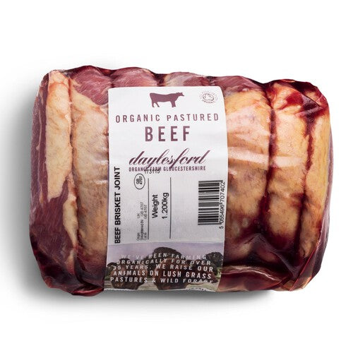 This Daylesford brisket is sourced from beef raised under strict organic farming standards for over 35 years. The cattle graze on lush grass pastures and wild forage, ensuring quality from farm to table. This premium cut is perfect for slow cooking or preparing as a substantial roast.
