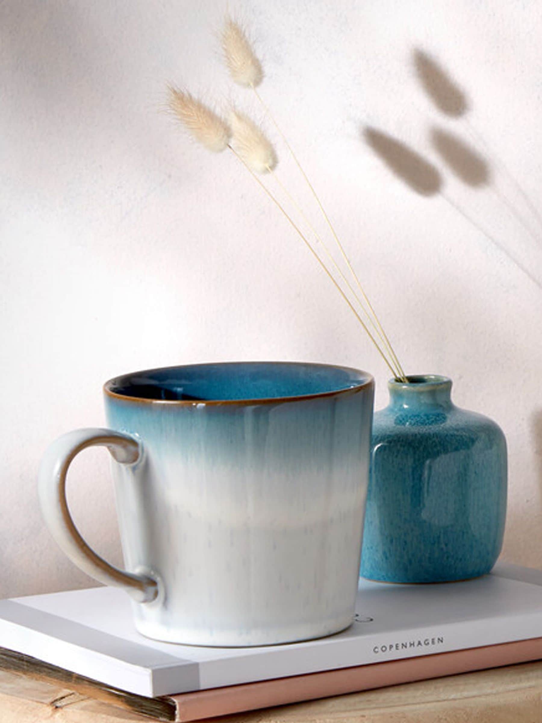 Denby’s Azure Haze stoneware collection features aquamarine and soft blues that infuse to create a stunning range of contemporary tableware. All items are made from strong Derbyshire clay, and so as well as being beautiful, they are also durable and practical. These mugs are perfect for everyday use and would make an ideal gift for someone special. A little more about the Haze Mugs:- Length: 13cm, Width: 9.5cm, Depth: 9cm, Capacity: 400ml. Hand-Crafted at the Denby Pottery factory from high quality, locally sourced clay. Expertly glazed to enhance durability. Denby 10 Year Guarantee. Oven, microwave, dishwasher, and freezer safe. Also available in Azure Haze are a 12 Piece Set, Plates, Cereal and Pasta Bowls.
