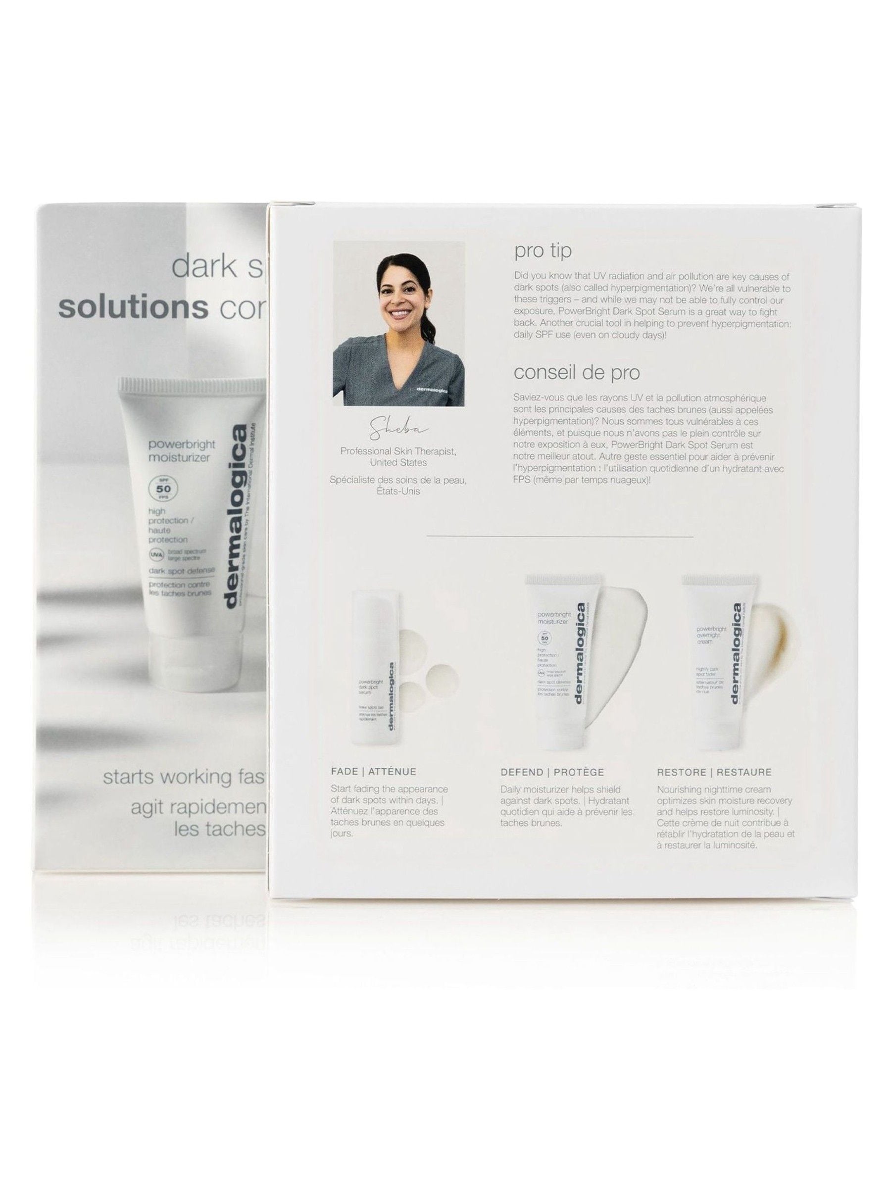 Starts working fast to visibly fade + help prevent dark spots. Kit contains: 1 x PowerBright Dark Spot Serum 0.34oz, 1 x PowerBright Moisturizer SPF 50 0.4oz, and 1 x PowerBright Overnight Cream 0.5oz.