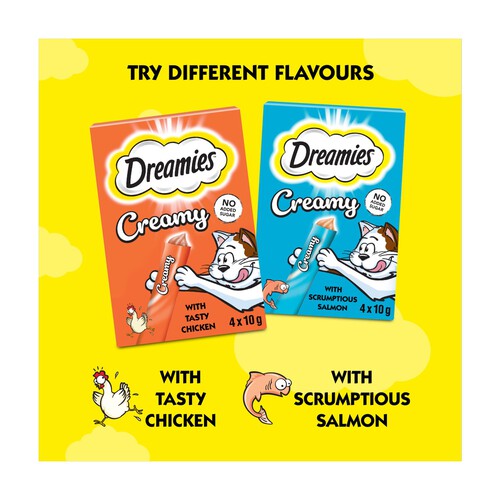 Dreamies™ Creamy cat treats are available in delicious flavours: With Tasty Chicken & With Scrumptious Salmon.