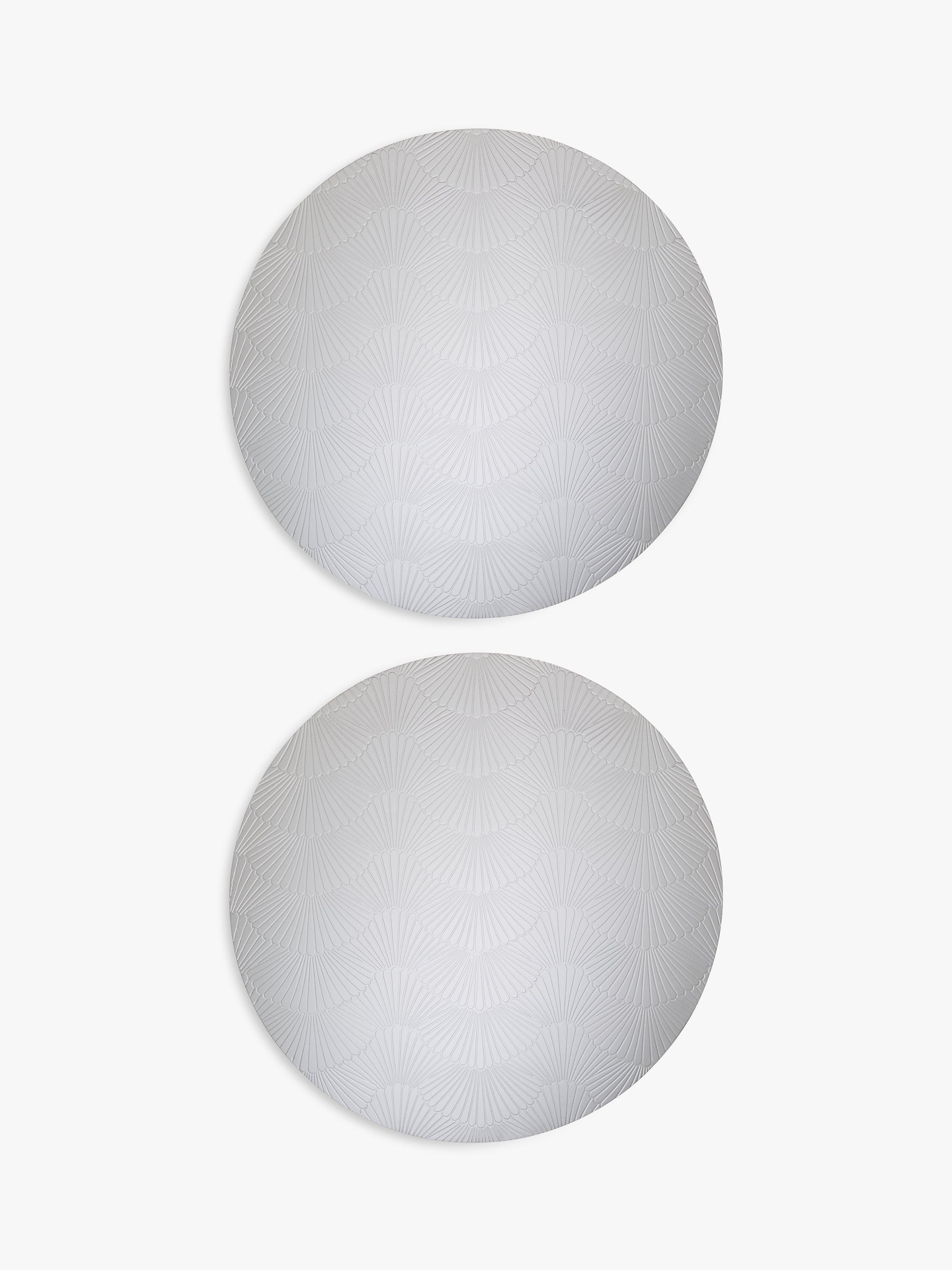 These John Lewis stainless steel placemats are supplied as a functional set of two round pieces for your main dining settings. Each placemat displays a beautiful, handmade, etched scallop design, offering robust protection and sophisticated texture. This durable tableware maintains its finish well, perfect for elevating any meal presentation.
