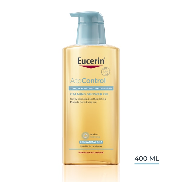 eucerin atocontrol bath shower oil helps to protect the skins natural barrier from further dryness and itching this bath shower oil is soapfree fragrancefree and enriched with a high concentration of omega oils to soothe skin with atopic dermatitis the symptoms of which include dry irritable and itchy skin many harsher cleansers exacerbate these symptoms but the gentler nature and combination of oils in this cleanser oil helps to relieve itching the cleansing oil can be used daily during flareups but also between flareups when the skin is less irritated product benefits fragrancefree soapfree suitable for adults children and babies over three months old for dry itchy and irritated atopic skin soothes skin leaves it feeling soft enriched with omega3 and omega6 oils