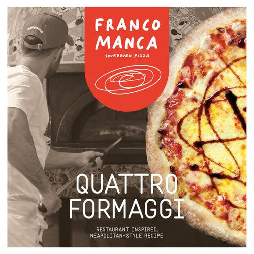 Enjoy the authentic Neapolitan-style experience of Franco Manca with this Quattro Formaggi sourdough pizza. This vegetarian option features a signature base topped with a rich blend of four distinct cheeses and finished perfectly with a balsamic drizzle.