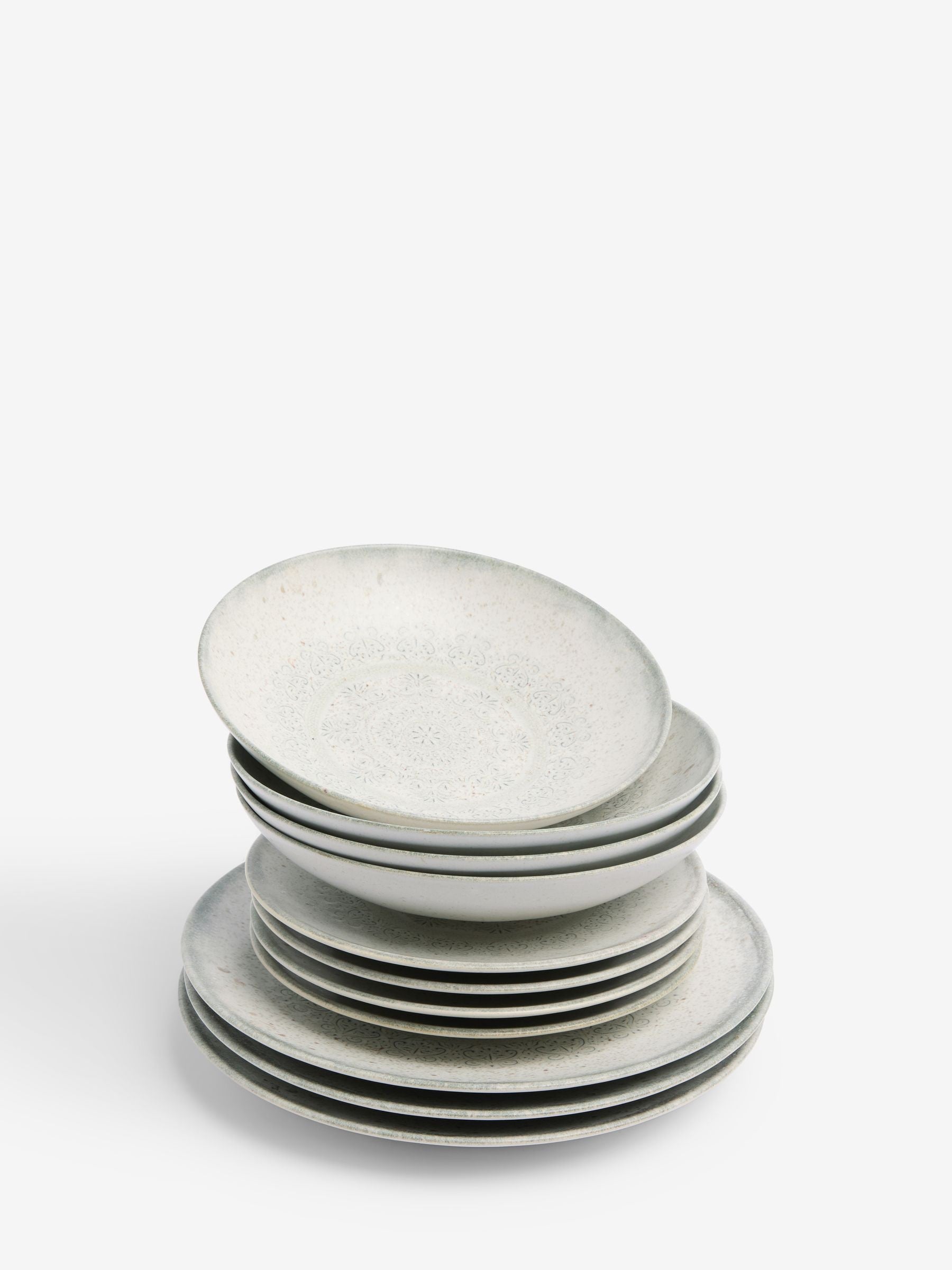 Treat your tablescape to some clean, sleek and modern crockery with the Westcott Dinner Set from French Connection. Made in Portugal and crafted from pure stoneware, this 12 piece set includes 4 dinner plates, 4 side plates and 4 bowls all boasting a white base and coated in a reactive finish.