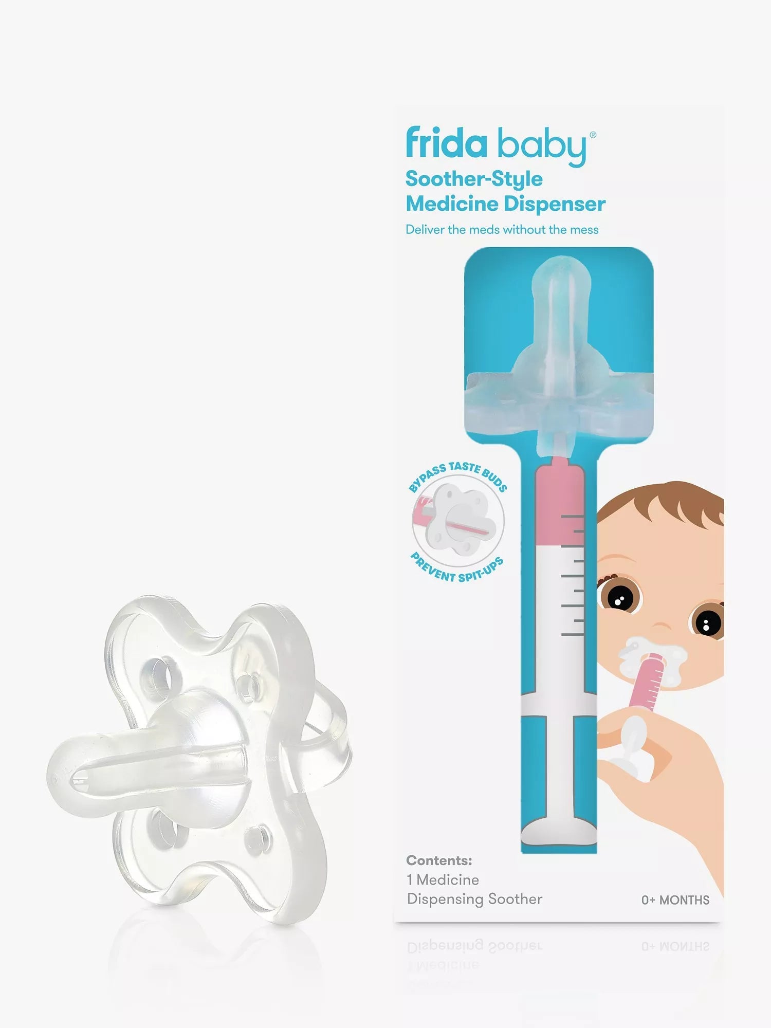 The Soother-Style Medicine Dispenser delivers medicine doses through a soft, soother-like holder that sends medicine to the side of the cheek, bypassing baby's taste buds while not disrupting baby's schedule. Soother-style baby medicine dispenser sends medicine to the side of the cheek, as recommended by doctors, to prevent spit-ups and ensures accurate dosing, every time, by bypassing baby's taste buds.