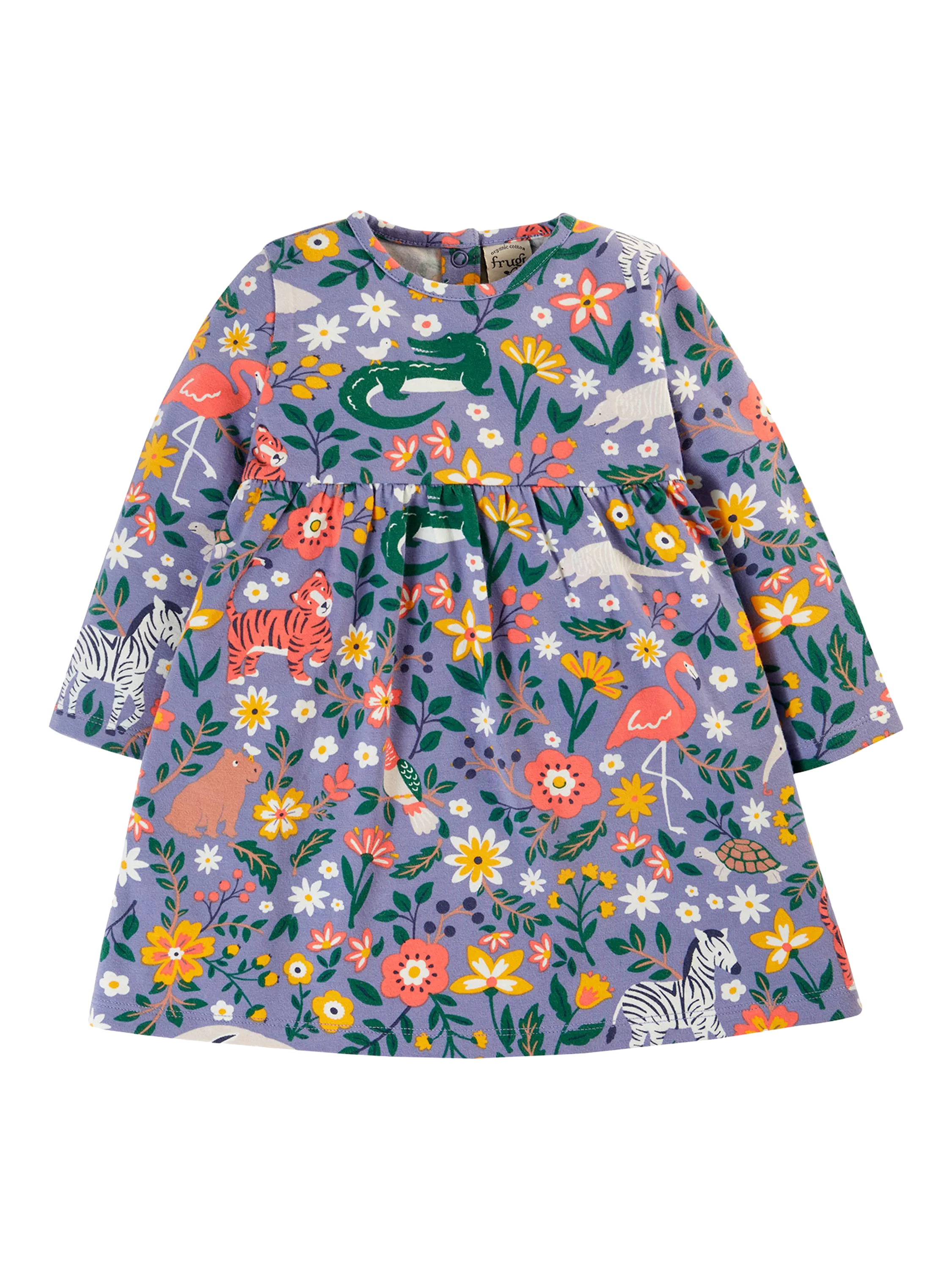Crafted from organic cotton with stretch for comfort, this long-sleeve dress features a vibrant animal and floral print. Features popper buttons at the back to help with easy dressing and quick changes.
