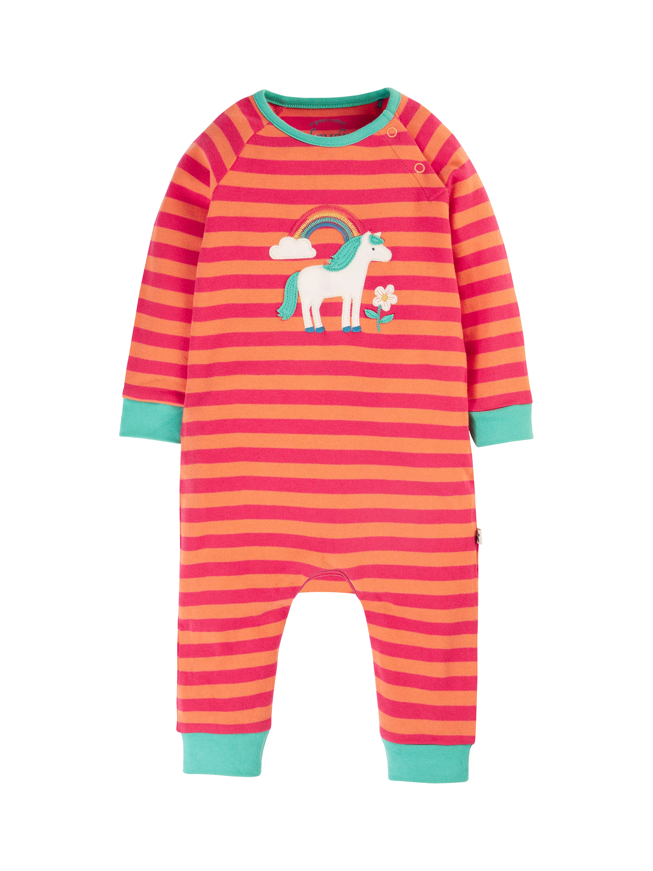 This long-sleeved baby romper has an applique unicorn on the chest. There are side neck popper fastenings and jersey lining on the front panel for extra comfort.