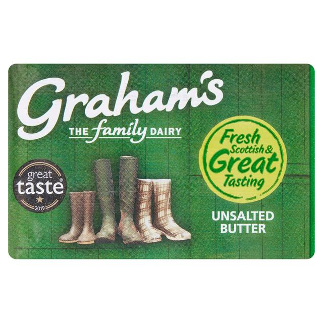 Product details Description Unsalted Scottish Butter Minimum 80% Milk Fat Fresh Scottish & great tasting Great taste 2019 Vegetarian Society Approved The Graham's family have always made butter the way it is meant to be and this fresh, creamy unsalted butter is definitely no exception. The Grahams Vegetarian Society Approved...