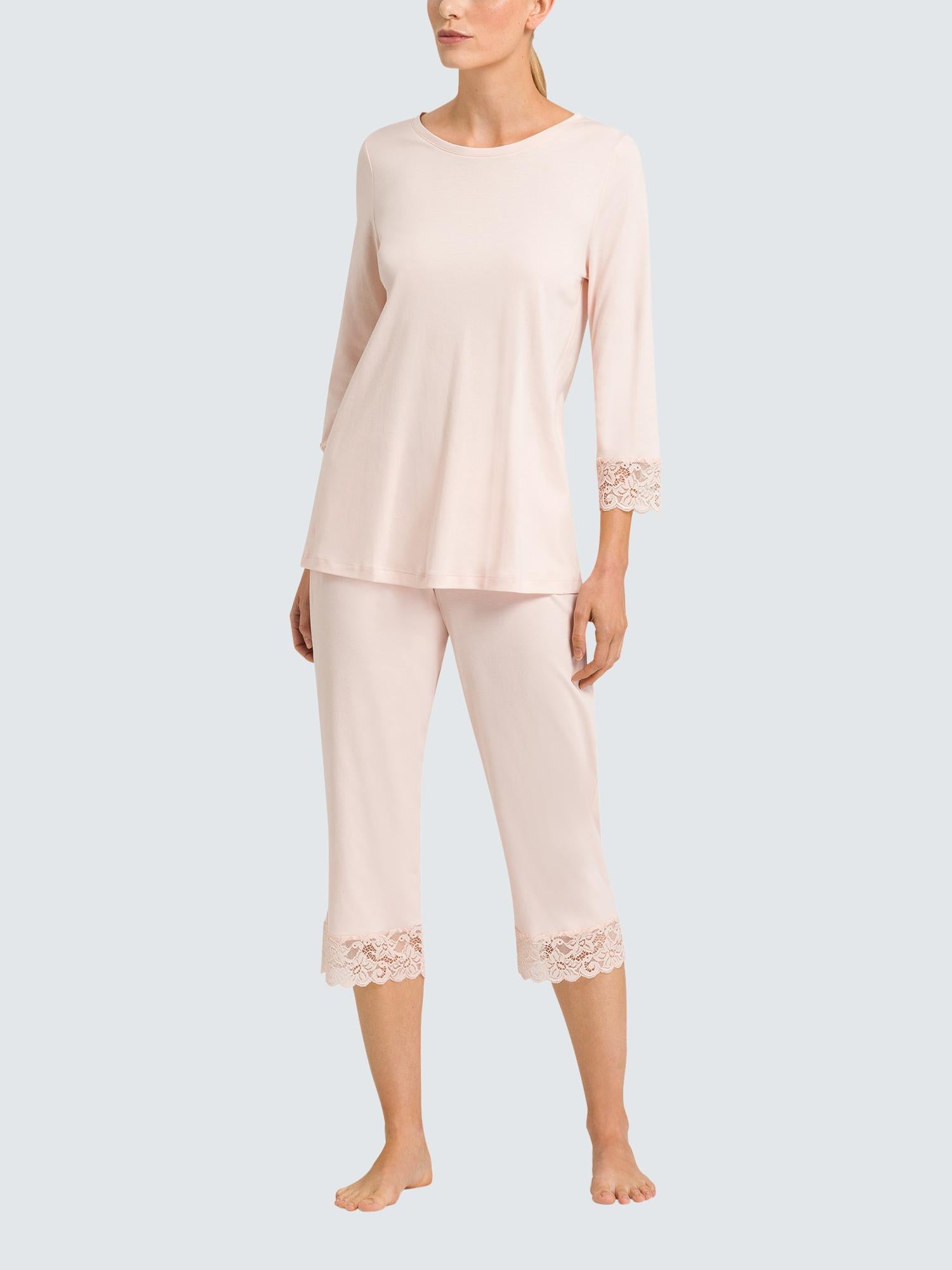 Made from the softest mercerised cotton featuring charming lace accents with a touch of transparency. This 2-piece pyjama set features 3/4 length sleeves, a lace insert around the arm and leg cuffs, with cropped bottoms.