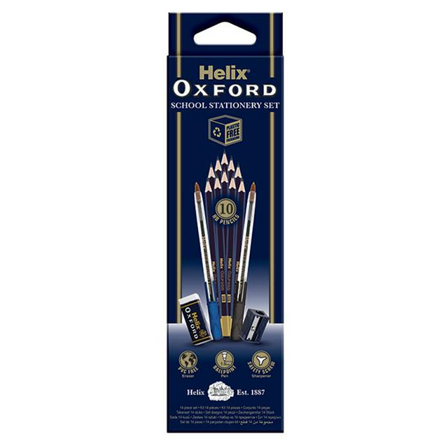 Product details Description A complete stationery set, ideal for school. • Premium quality Helix Oxford branded products. • 10 x HB pencils. • Blue and black ballpoint pen. • Sleeved eraser and a pencil sharpener. • PVC free eraser and safety screw on pencil sharpener. • Plastic free packaging. Customer rating
