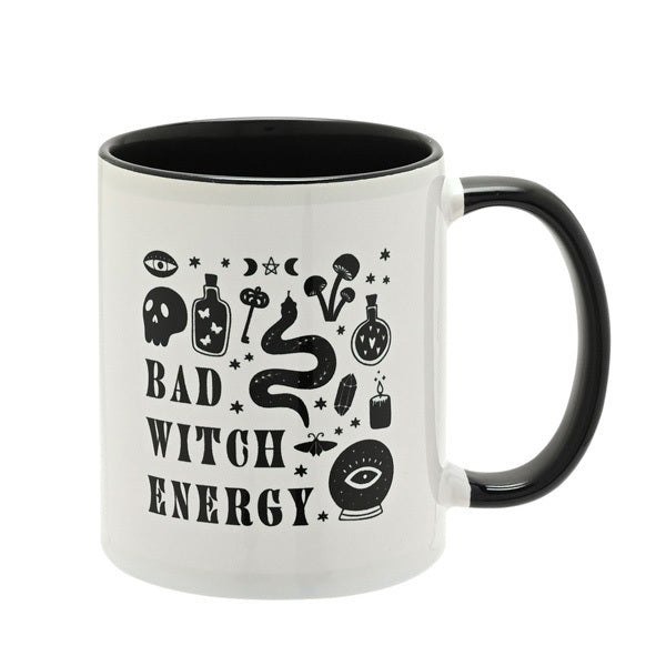 a bad witch energy black handled mug in stoneware and a glazed finish this classic mug strikes a playful tone with bad witch energy wording and witch motifs