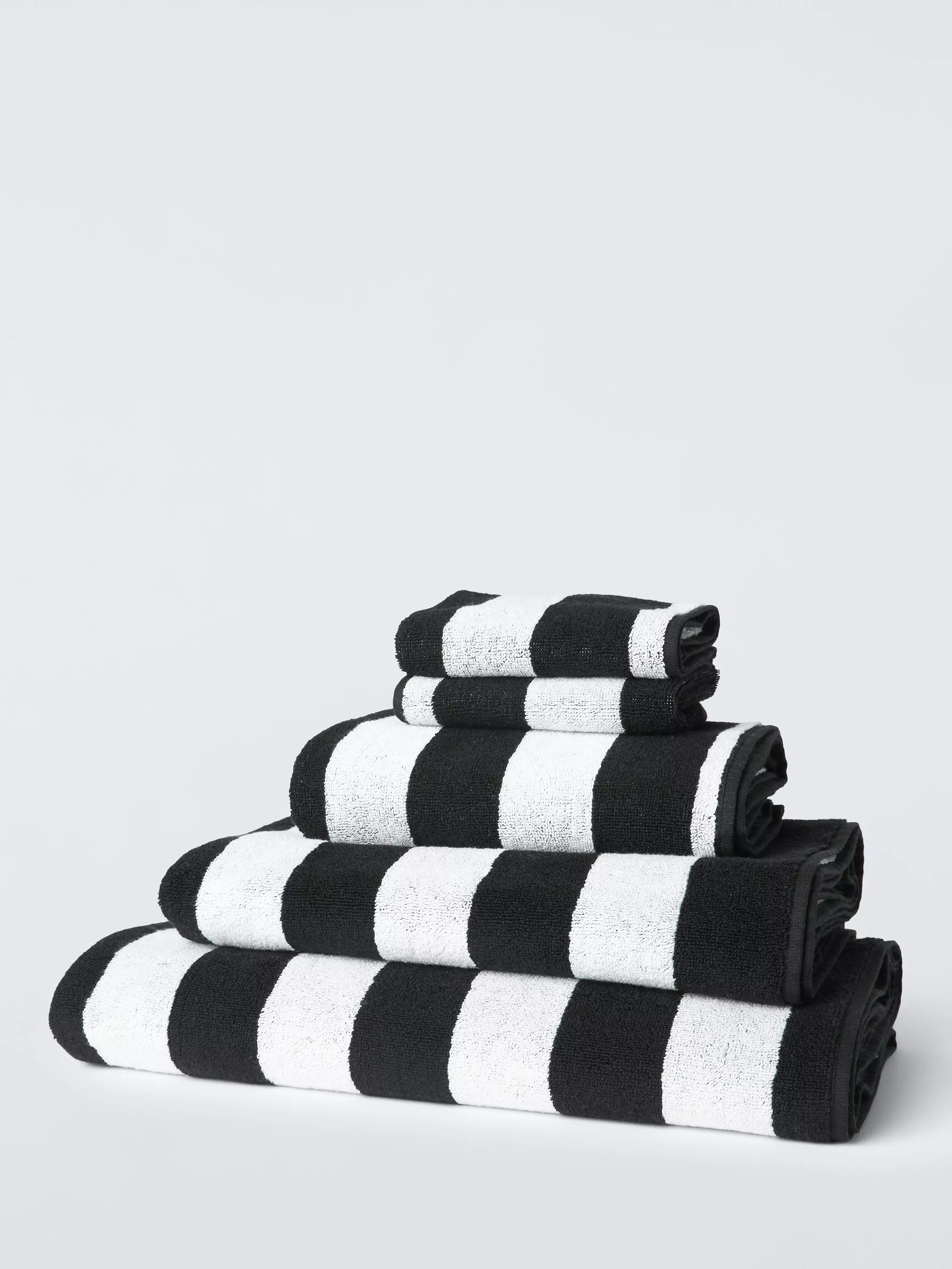 Simple and smart black and white striped towels for a classic bathroom look.