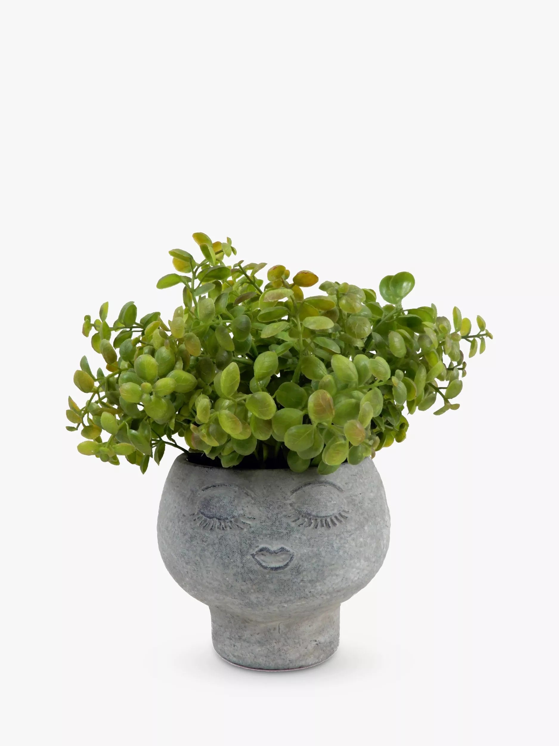 Add a touch of quirky charm to your home with this unique stone planter featuring an artificial eucalyptus bush. The etched face on the planter gives the eucalyptus a fun, “hairstyle” making it a conversation starter. This decorative piece is perfect for adding a touch of nature-inspired style to any room.