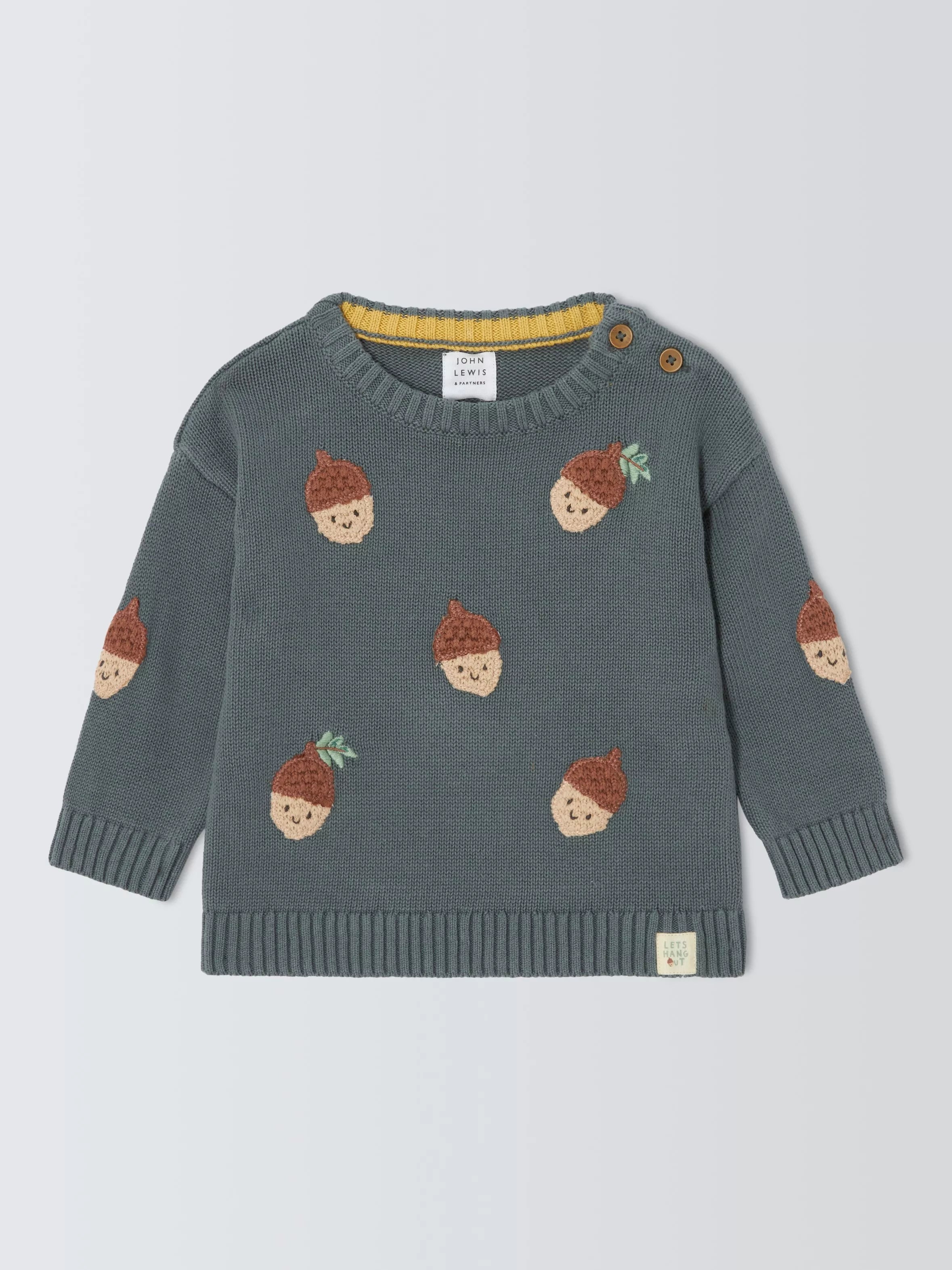 Made from 100% cotton, this jumper is covered in embroidered smiling acorns. The ribbed cuffs and hemline ensure a great fit while the buttons on the shoulders aid with dressing.