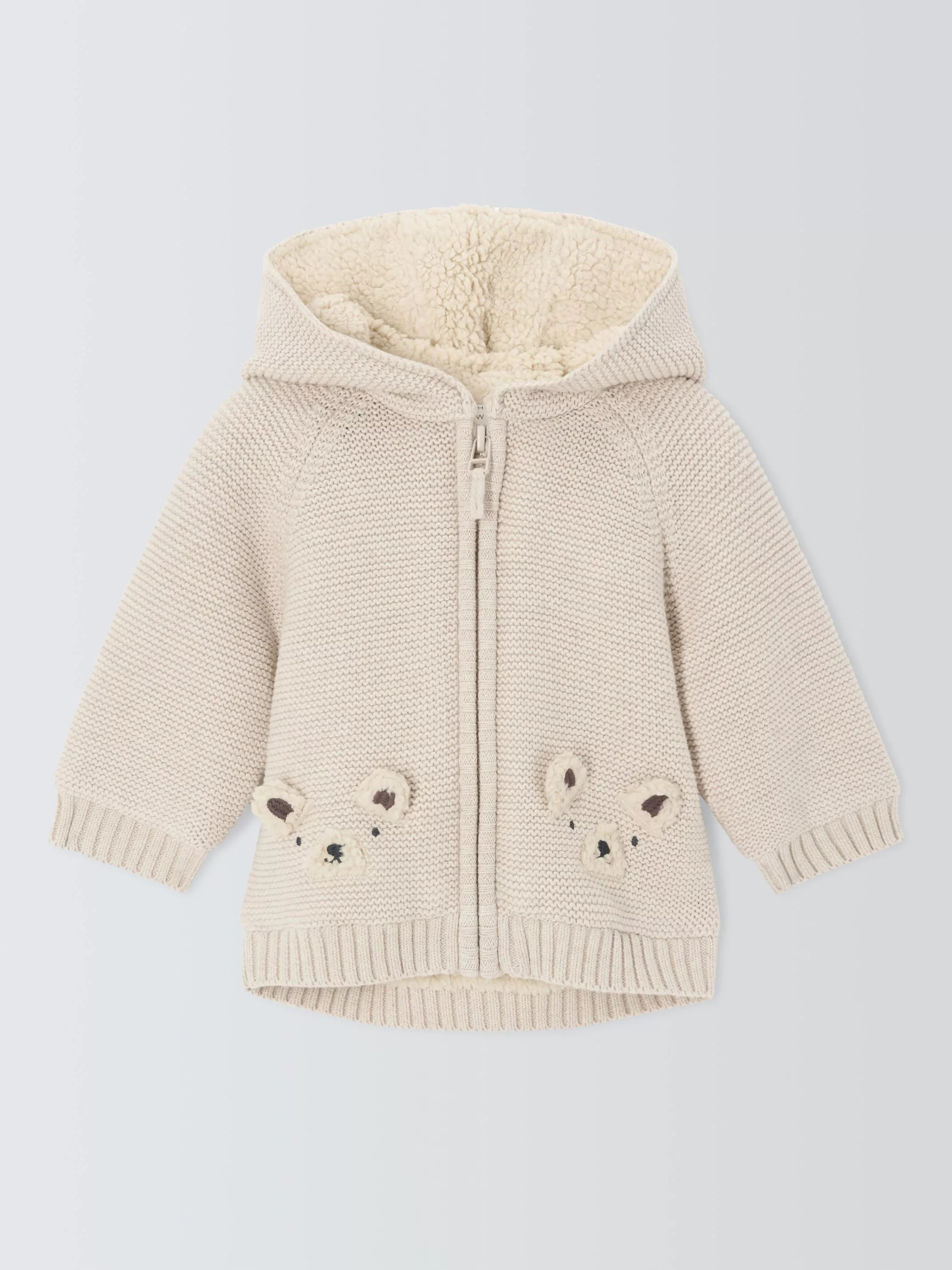 A knitted cotton shell combined with a soft polyester fleece lining and hood make for the cosiest, comfiest winter cardi. Two bear faces are sewn into the design on either side of the zip front for added cuteness.