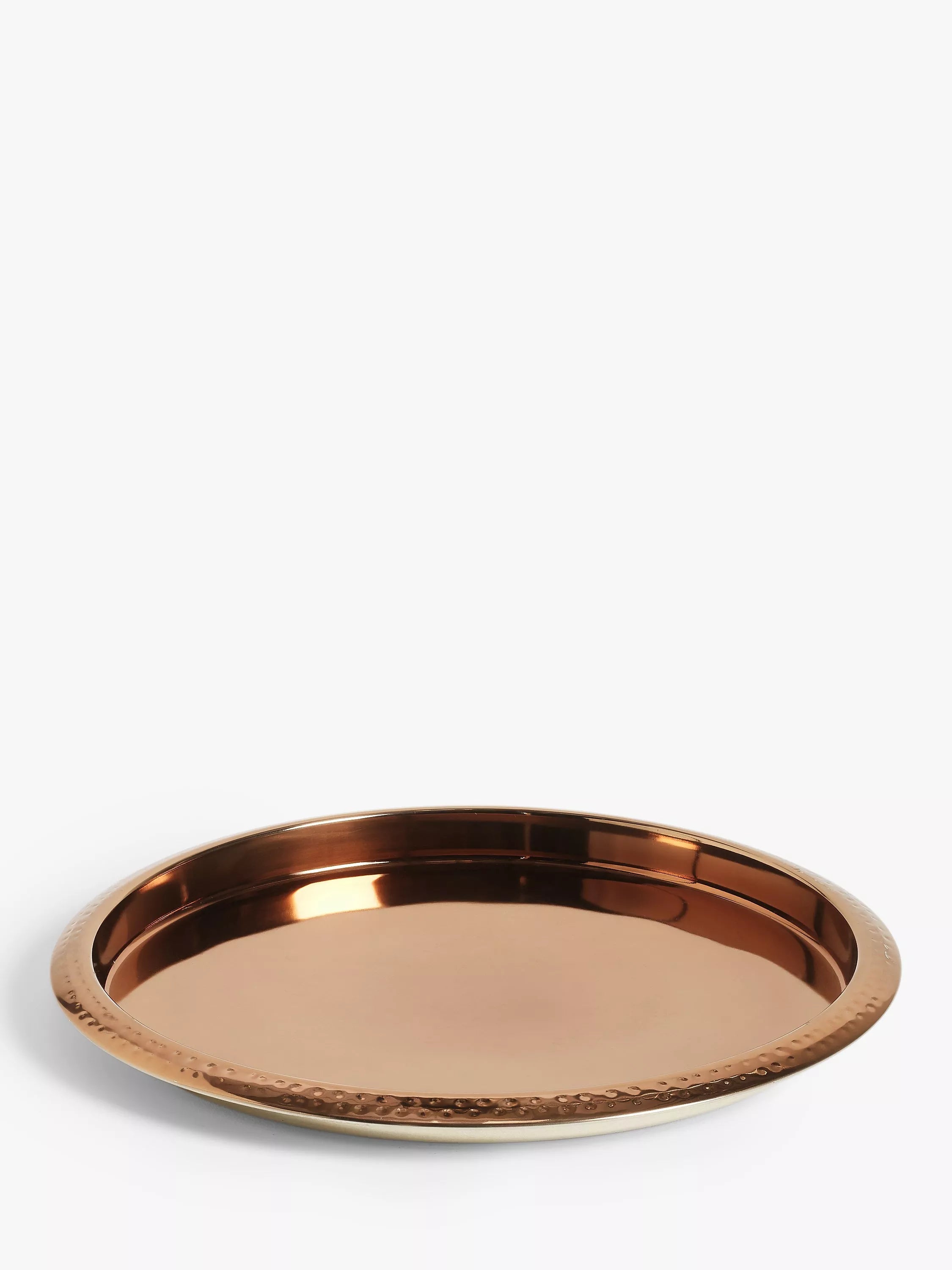 Add a touch of elegance to your entertaining with this stunning copper-effect serving tray. Its hammered detail adds a unique artisan touch, perfect for sophisticated gatherings. Impress your guests with this stylish addition to your home.