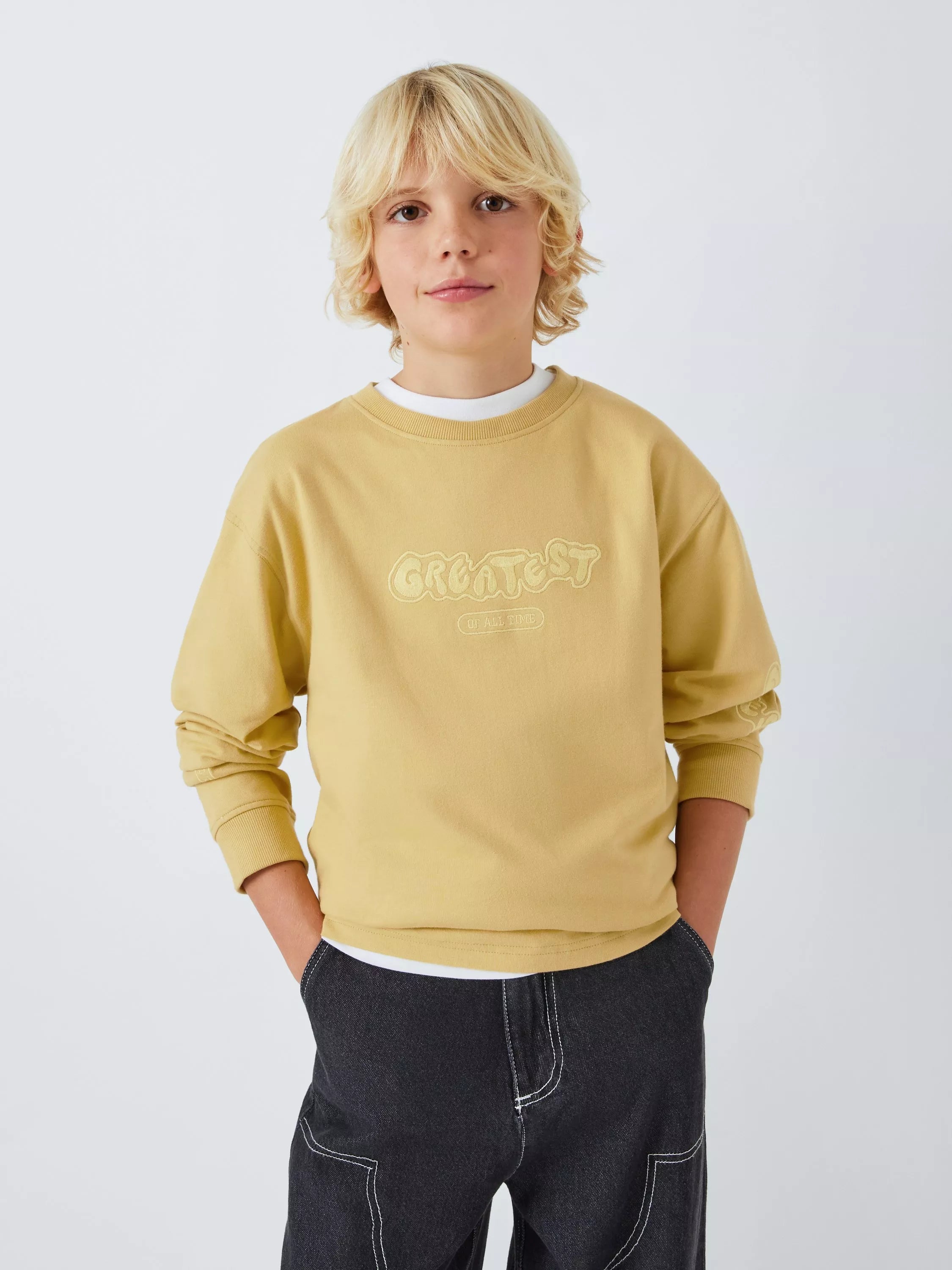 Give your little one a style boost with this fun and comfortable kids' sweatshirt! Featuring a cool "Greatest of All Time" embroidery, it's perfect for everyday wear and playtime. Made from soft, pure cotton, this top offers both comfort and style.