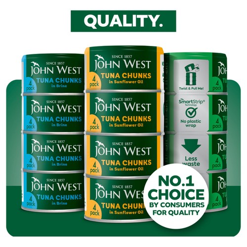 Introducing the John West Tuna Chunks ECOTWIST® multipack – our most eco-friendly, faff free option yet! Featuring an aluminum SmartStrip®, it’s easy to open with a simple twist. Fully recyclable, it eliminates messy plastic waste. Enjoy the same amount of succulent tuna in our new & improved can – voted best in class for taste and quality *