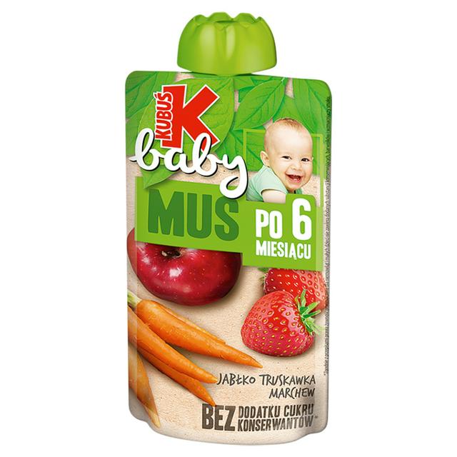 Kubus Baby Food Apple Strawberry Carrot Mousse 100g offers a thick, pasteurised texture for infants over six months old. This fruit and vegetable blend contains absolutely no added sugars; it naturally sweetens from the fresh apple, strawberry, and carrot contents. It is also gluten free.