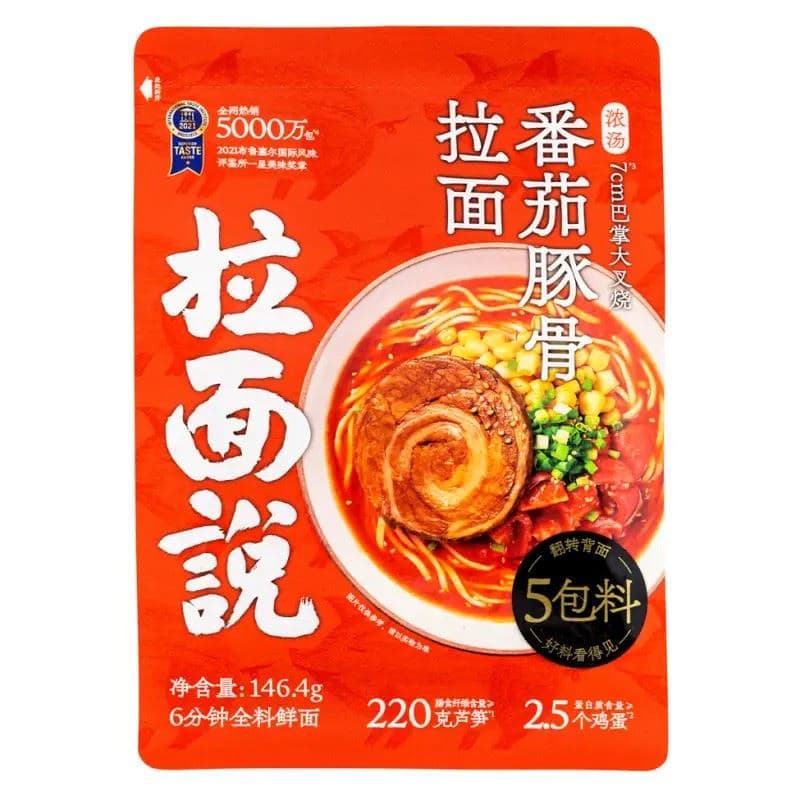 Delight in the vibrant and comforting taste of La Mian Shuo Tomato Tonkotsu Flavour Ramen. This ramen is complemented by four succulent meatballs, enhancing the overall dining experience. The combination of hearty broth, chewy noodles, and the juicy meatballs makes this ramen a wholesome and delightful choice for noodle enthusiasts. Enjoy the robust flavours and comforting warmth in every bowl, making it a delightful and memorable addition to your culinary repertoire.