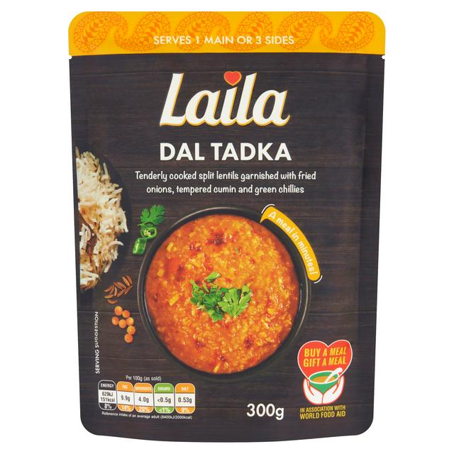 Product details Description Creamy dal of lentils simmered with mild spices and tomatoes. A meal in minutes! Suitable for Vegetarians Tenderly cooked split lentils garnished with fried onions, tempered cumin and green chillies Buy a Meal Gift a Meal In Association With World Food Aid Laila is working in association...