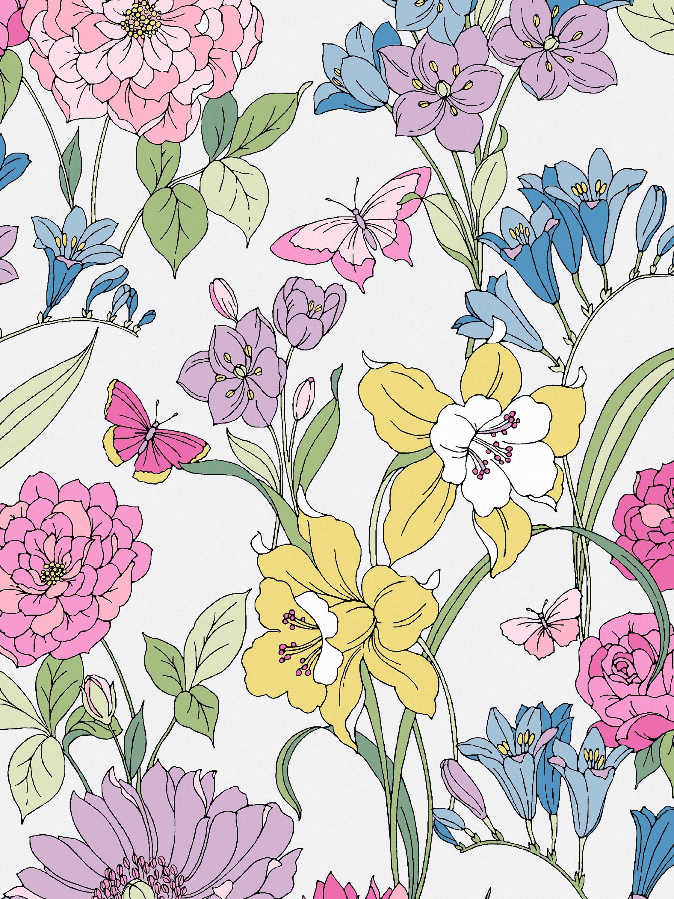 Read MoreInspired by a piece of painted artwork, this charming line-drawn floral design features an abundance of stylised blooms like dahlias, daffodils and delphiniums forming a continuous pattern. Delicate butterflies perch on curling stems in this striking print.