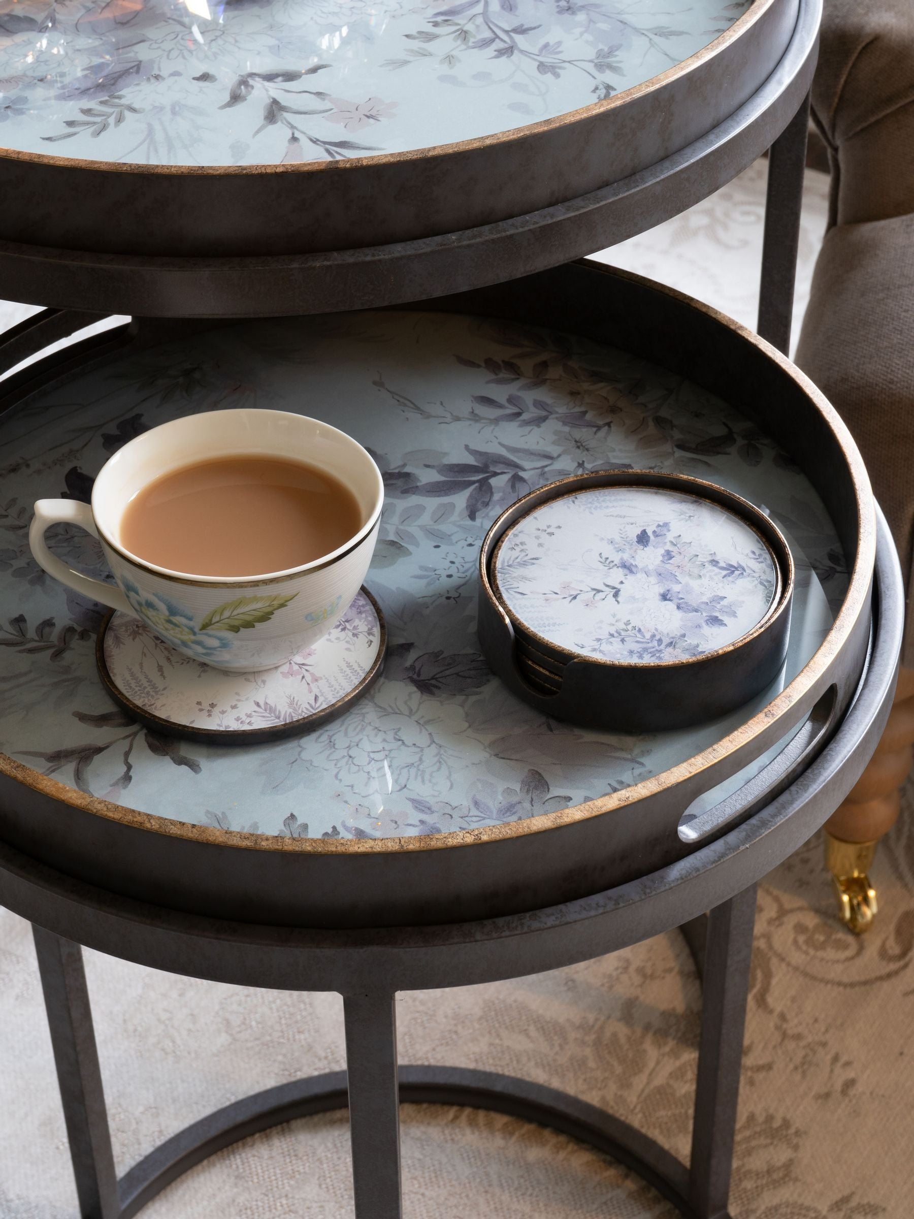 Elevate your home decor with these beautiful Laura Ashley Coasters featuring the elegant Linlithgow floral print illustrating delicate blooms and foliage. The delicate blend of soft pastels including pink, green, and grey create a serene and sophisticated palette, effortlessly combining vintage elegance with contemporary style. These coasters not only protect your surfaces from spills and stains but also add a touch of timeless elegance to any room.