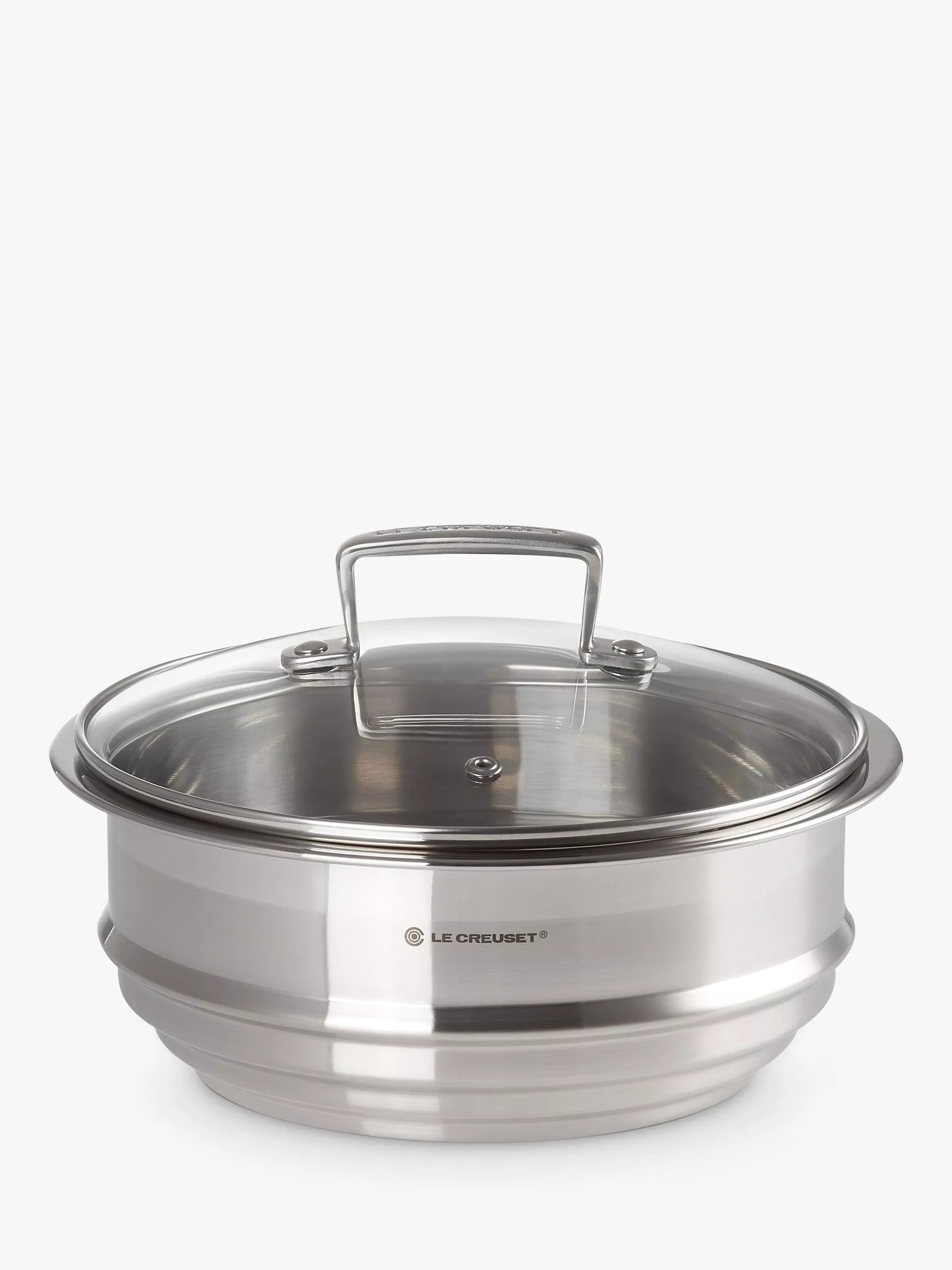 A steamer basket and heat-resistant glass lid for use with Le Creuset's 3-Ply stainless steel range. The step design fits any Le Creuset 3-ply Stainless Steel 16cm, 18cm and 20cm diameter pans and can be used with multiple steamer baskets.