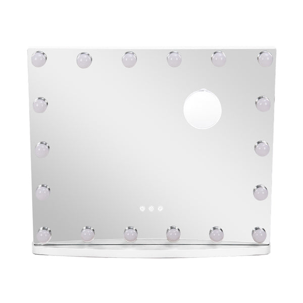 Adjustable brightness with three lighting colour modes Smart touch control and memory function Come with a detachable 10X magnification Specifications Overall Dimensions: 58cm W x 12cm D x 48.5cm H Mount Type: Freestanding Mirror Type: Bathroom / Vanity; Makeup / Shaving Shape: Rectangle Orientation: Vertical Framed: Yes Frame Material: Iron Colour: White Power Source: Plug-in Plug Included: Yes Lighting Included: Yes Bulbs Included: Yes Number of Bulbs: 18 Dimmable Lighting: Yes Magnifying: Yes Package Content 1 x LED Makeup Mirror 1 x Power Adapter Package Specifications Package Dimensions (WxDxH): 64 x 58 x 20cm Gross Weight: 6.2kg