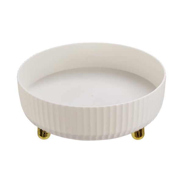 textured surface adds a modern and aesthetic sense antislip gold feet allow the organizer to stand stably plastic made resistant to water and stains and easy to clean 360 degree rotating base with a large capacity suitable for storing cosmetics snacks fruits sundries etc specifications overall dimension 28cm dia x 10cm h type serving overall shape round material hipsabs finish pearl white package content 1 x rotating round spice rack package specifications package dimensions wxdxh 30 x 30 x 11cm gross weight 064kg