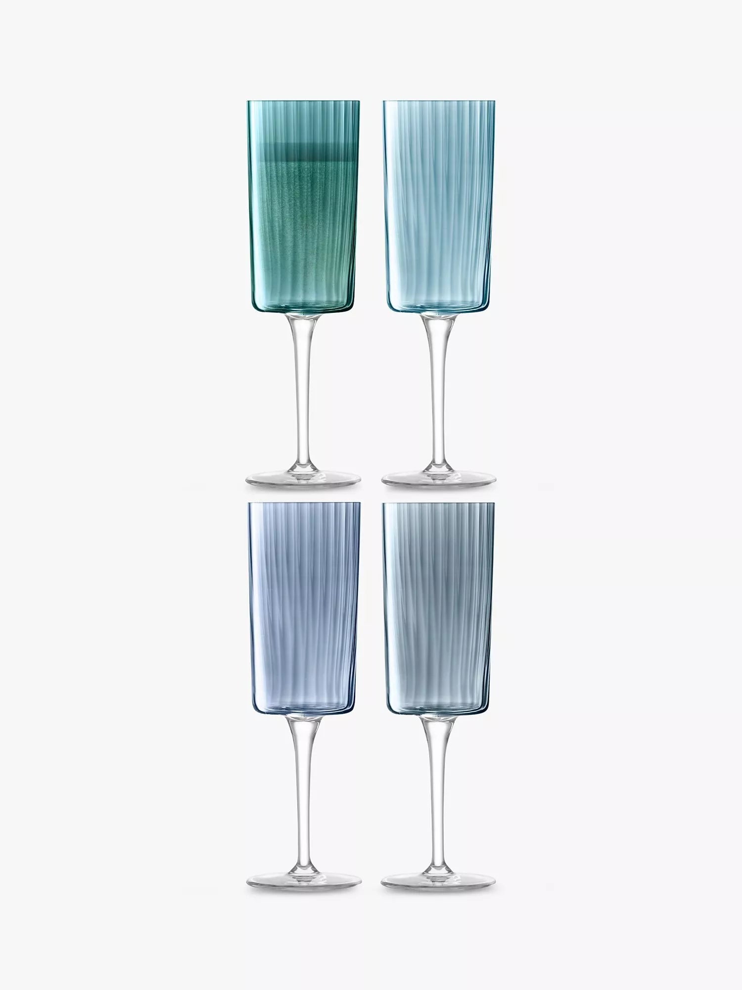 A set of four Gems flutes from LSA International with assorted hand-applied, jewel-coloured lustres inspired by semi-precious stones. The fine walls of each glass are fluted in texture like faceted gems that catch the light. Use for serving red champagne, prosecco and sparkling wine. The narrow bowl helps to retain bubbles.