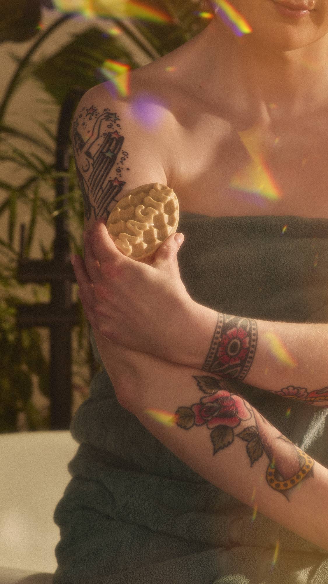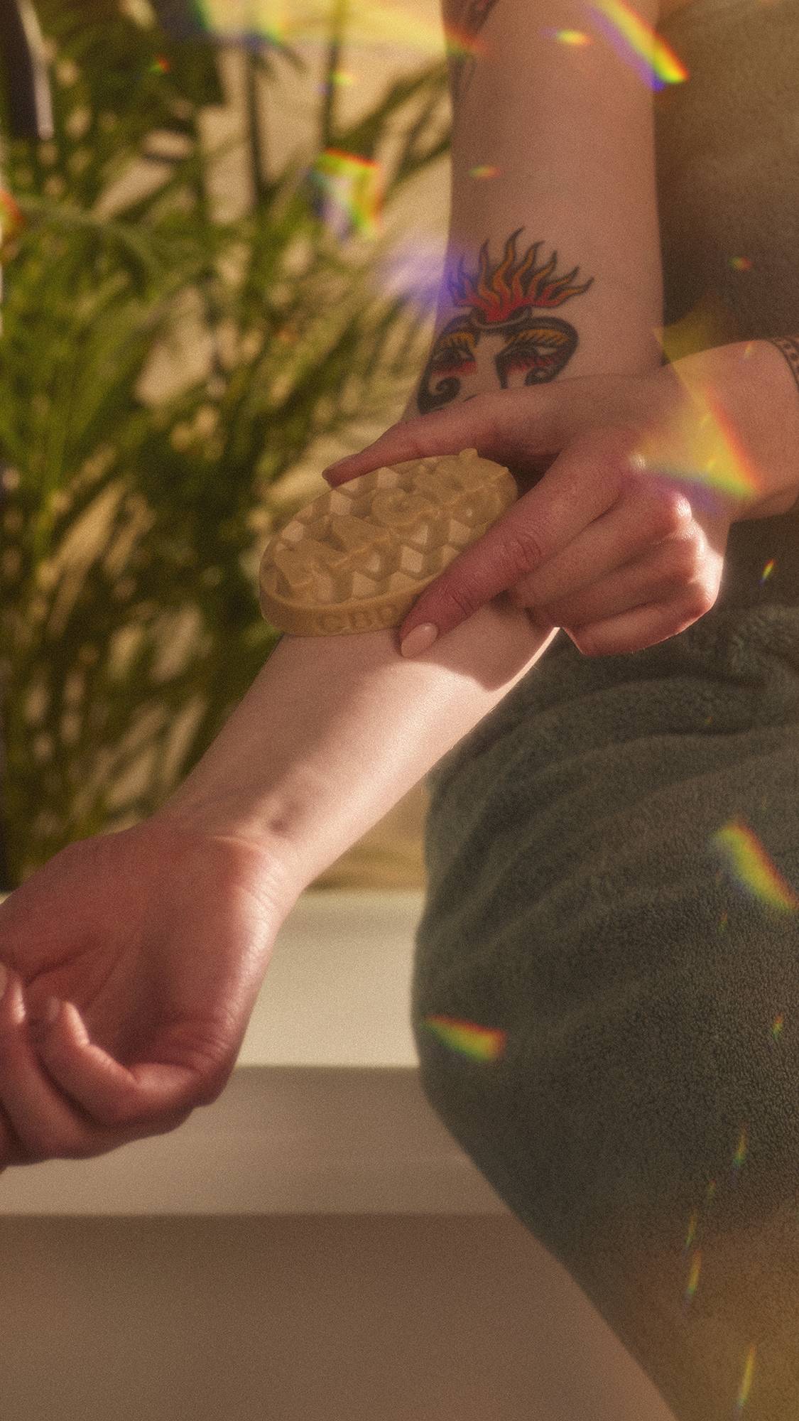 Melt the bar directly onto dry skin and massage the oils and butters in. If the bar is cold, begin by warming between your hands to melt. Lush massage bars are generously oil-rich, so apply as much or as little as desired and re-apply as needed.