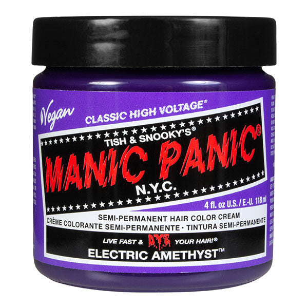 Manic Panic High Voltage Classic Hair Colour in Electric Amethyst. Bright hair colour at its best, this iconic formula is semi-permanent, vegan and cruelty-free.