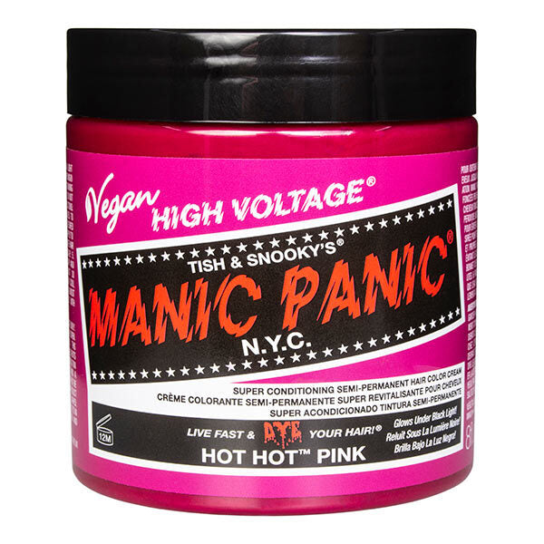 Achieve vibrant pigmentation with Manic Panic High Voltage Hot Hot Pink semi-permanent dye, now available in convenient 8oz (237ml) pots. This conditioning formula provides intense colour payoff while caring for your hair strands during the process.