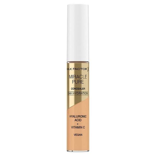 Read Morebelieve in miracles inspired by skincare mastered by max factor new miracle pure concealer is clinically proven to care for skin while you wear it the lightweight formula contains hyaluronic acid vitamin c and peptides it gives medium natural coverage and works perfectly on the face and under the eyes providing creaseless all day gentle coverage illuminating brightening and giving 24hydration clinically and dermatologically tested suitable for sensitive skin with a super soft flexible and precise applicator available in 8 shades and designed to work in harmony with max factors miracle pure foundation